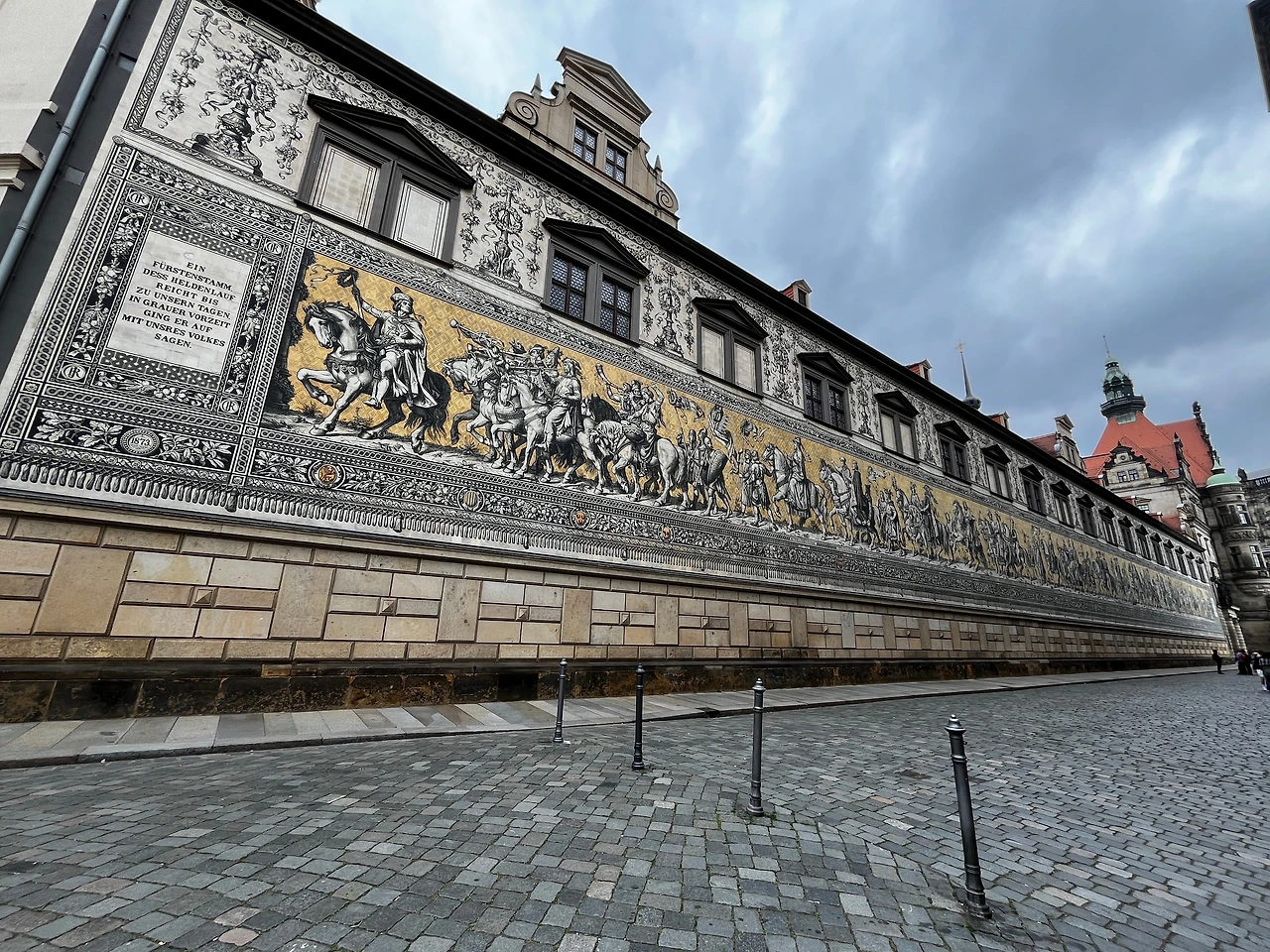 원래는 금과 보석 등으로 장식된 벽화였는데, 풍화와 세월을 맞아 보수를 거쳤고, 1900년대 초반 인근 마이센 도자기 공장에서 만든 타일로 재구성되었기 때문에 구워낸 벽화라고 표현해 봤다.