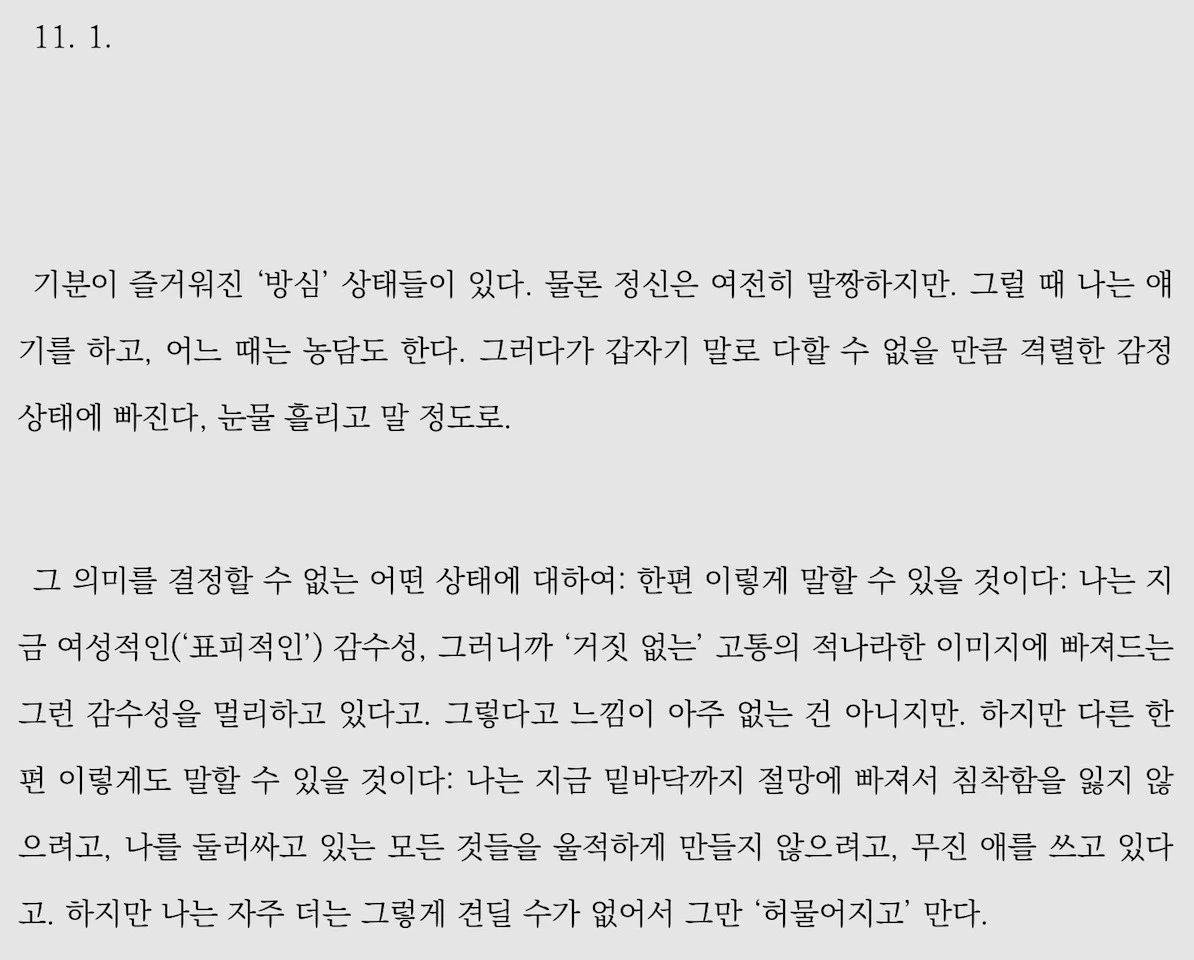 그래도 저런 애도하는 와중에 바르트는 열심히 연구하고 강의하고 글 쓰고 다 했던데...