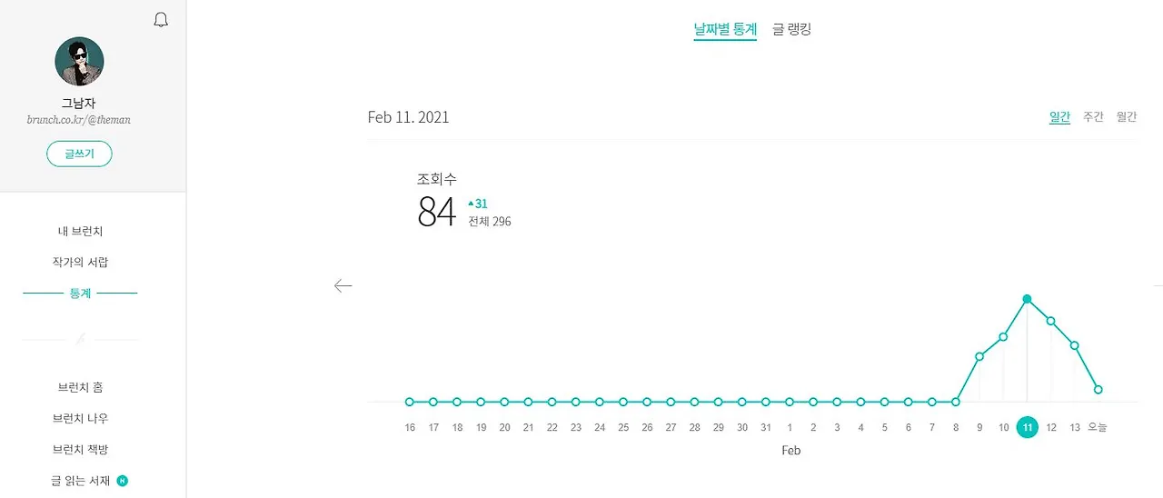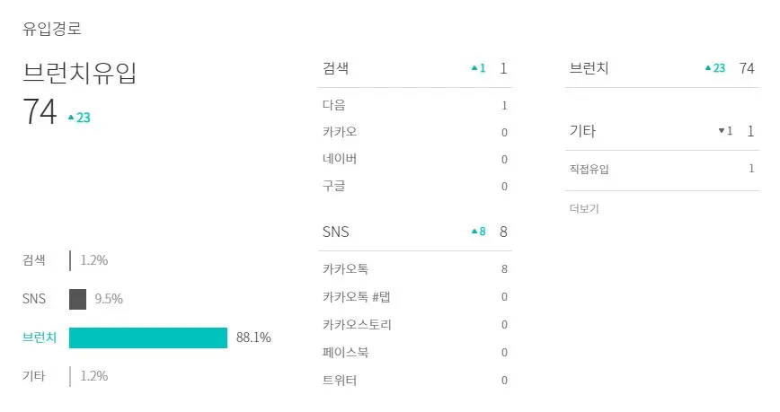ⓑ 사적인 이야기를 쓰다보니 SNS에는 노출하지 않는다. 브런치에서 유입되는 구독자가 대부분으로 추후 다른 주제로도 트렌드에 맞춰 다양하게 글을 쓰게 된다면 검색 유입도 늘어날 것 같다.