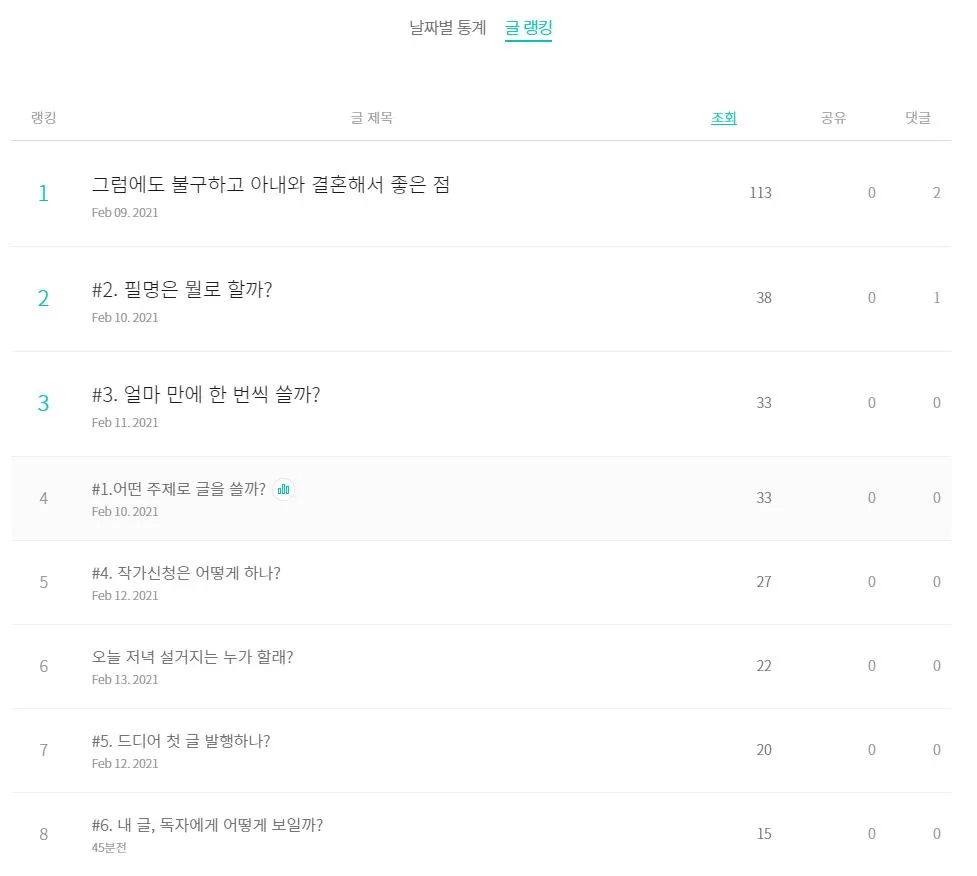 ⓓ 전체 글별 조회수로 랭킹을 확인할 수 있는데 어느 글이 반응이 제일 좋은지 확인 가능하다.