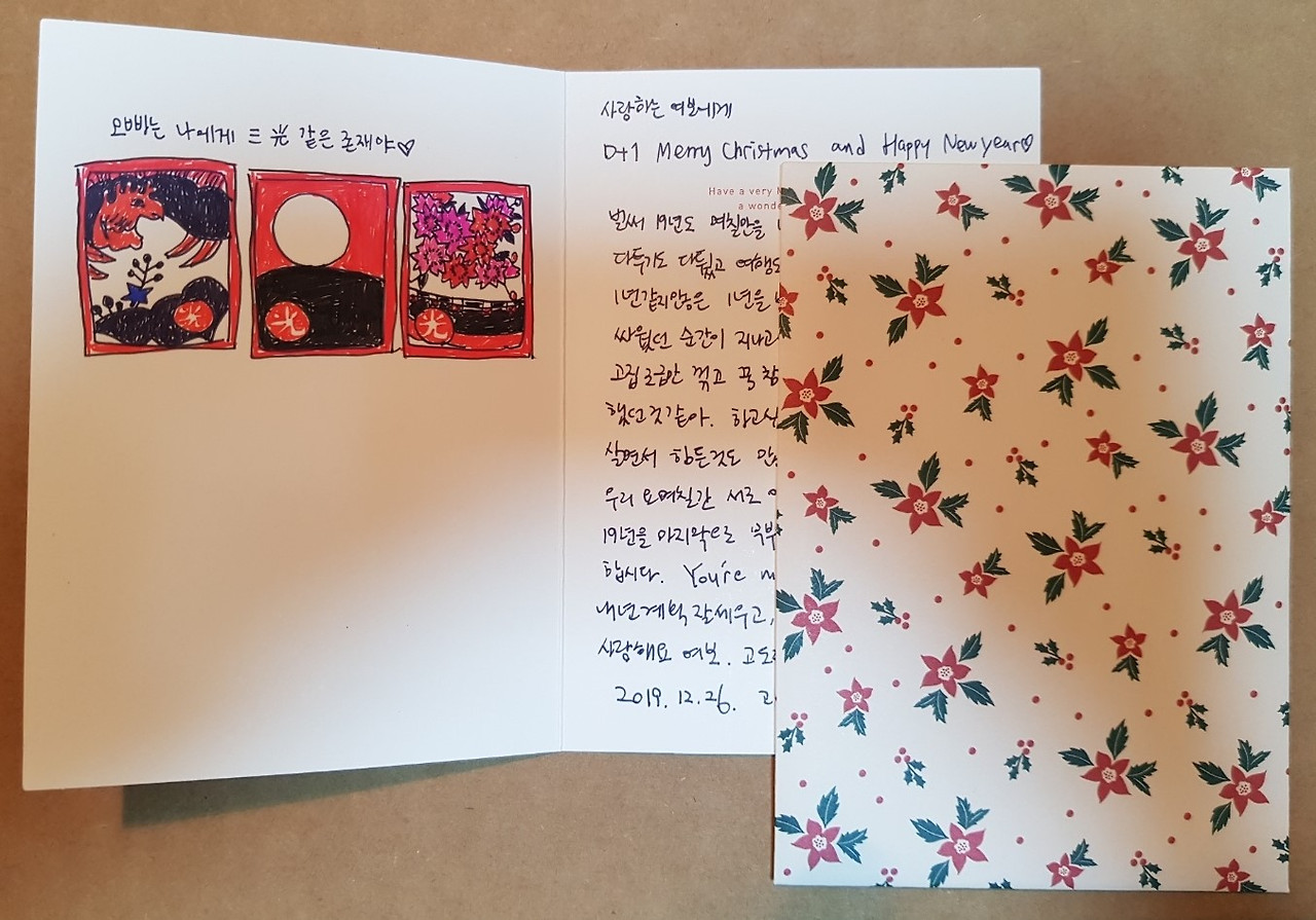 ③ 편지함은 우리 부부가 만드는 미술관이자 시화전이다. 우리 부부는 각자의 편지함에 편지를 모아 놓는데 한번씩 열어보면 예술이다. 편지지나 엽서에는 우리가 좋아하는 그림과 색으로 가득 차 있다. 반고흐의 <별의 빛나는 밤>과 이중섭 선생님의 <황소>가 있고 포르투에서 공수해 온 엽서는 코르크로 만들어진 작품이다. 직접 그려준 화투와 함께 "오빠는 나에게 三光같은 존재야"라고 적어준 멘트는 그 어떤 그림과 시보다 훌륭하다. 그리고 손으로 꾹꾹 눌러서 쓴 한 글자 한 글자는 눈으로 쓰다듬어 주고 싶을 정도로 사랑스럽다.