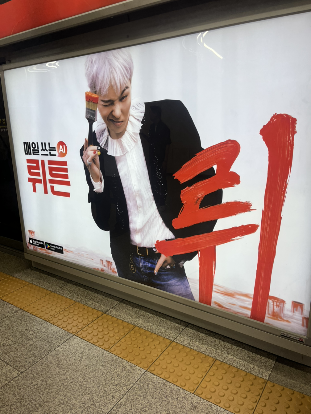 최근엔 ai뤼튼이 지드래곤을 광고모델로 써서 엥… 이건 또 뭐지 싶었다. 뭔 메시지를 전달하고 싶은지도 모르겠는 유튜브 광고에, 버스랑 지하철 옥외광고도 하던데…