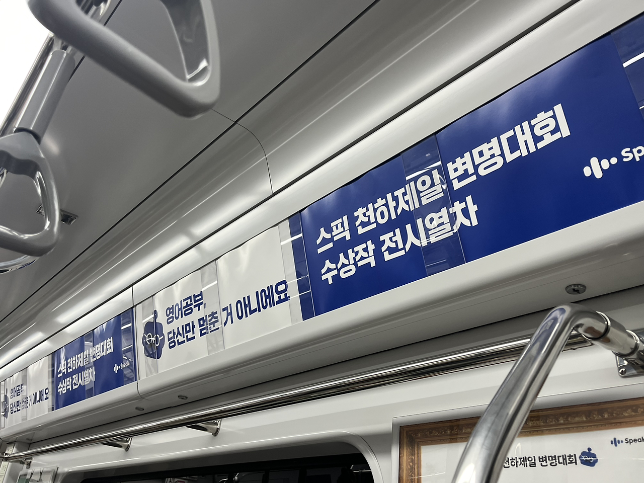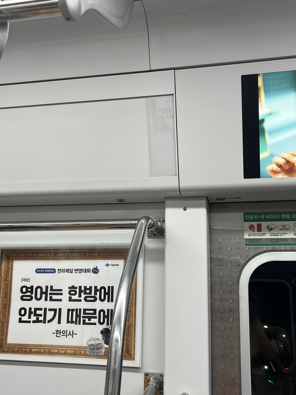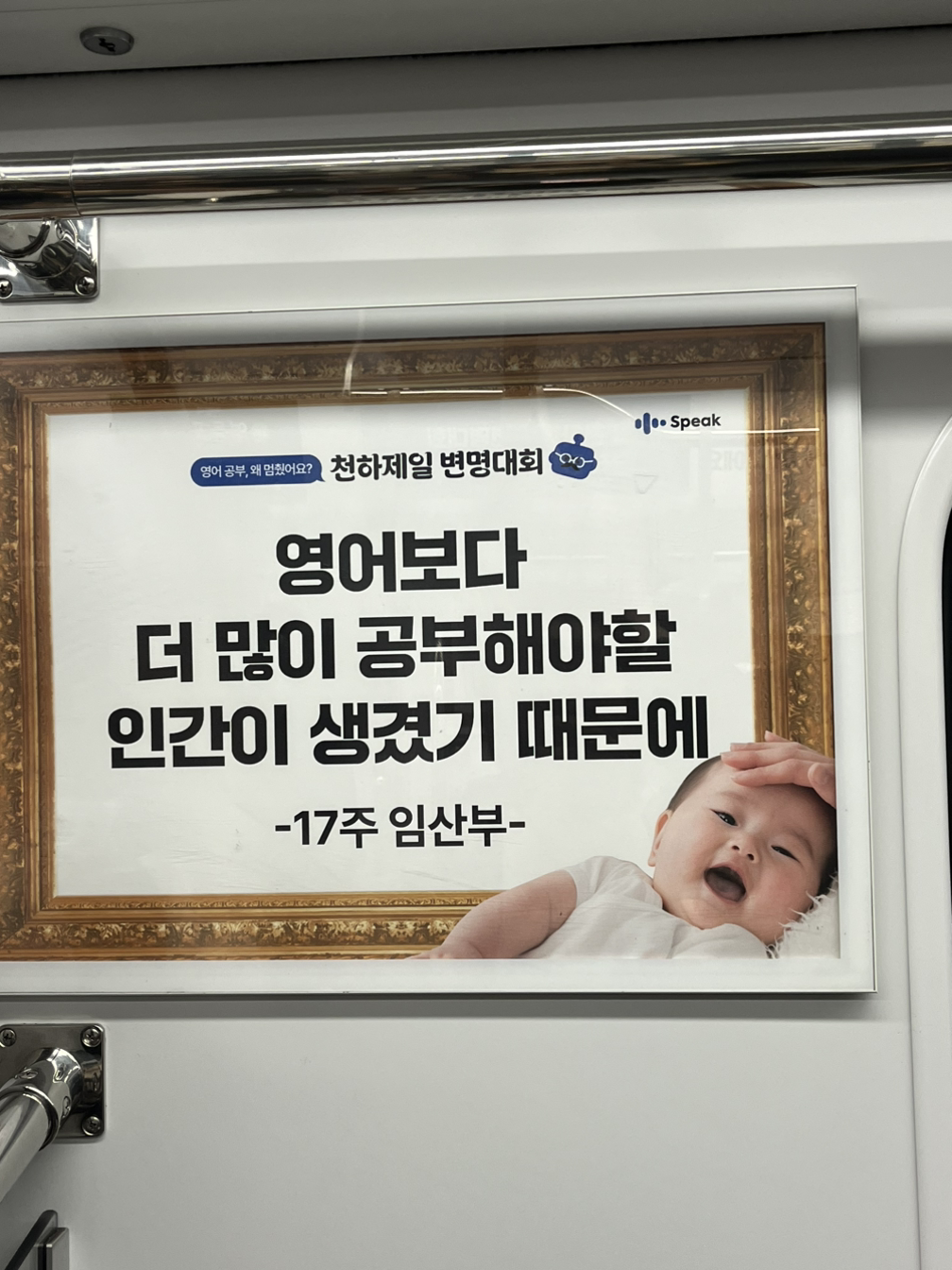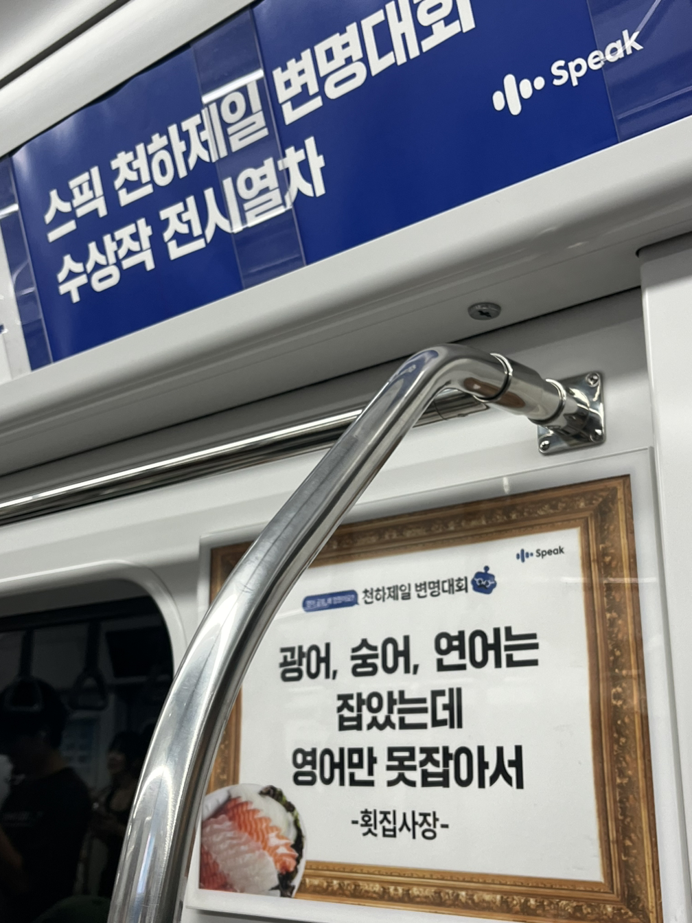 요즘 2호선을 자주 타는데요, 얼마전부터 스픽 천하제일 변명 대회 광고가 눈에 뛰더라구요. (처음 봤을 때부터 사진 찍고 싶었는데 아무래도 지하철이란 공간 때문에… 사진 찍기가 어려웠는데 오늘 드디어 다른 사람들을 피해서 사진을 찍는데 성공했어요 ㅋㅋ)