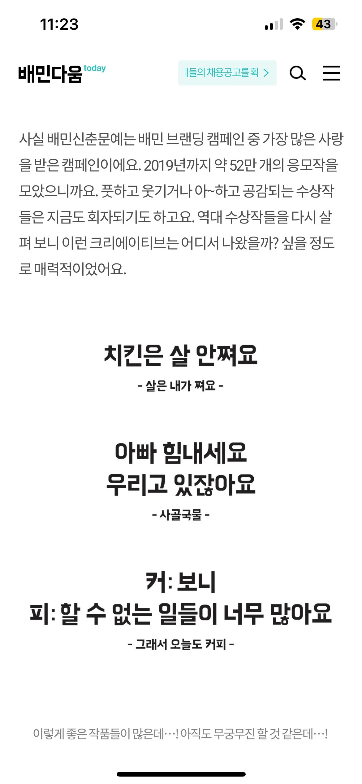 너무나 유명한 “치킨은 살 안쪄요 살은 내가 쪄요” 라는 전설의 커피를 탄생시킨 배민 신춘문예 공모전