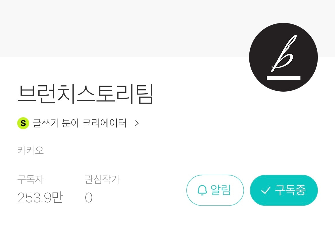 브런치 사용자가 얼마나 되는 정확히는 모르겠지만, 브런치를 가입하면 자동으로 팔로우하게 되는 브런치스토리팀의 구독자수가 약 254만 명이다.