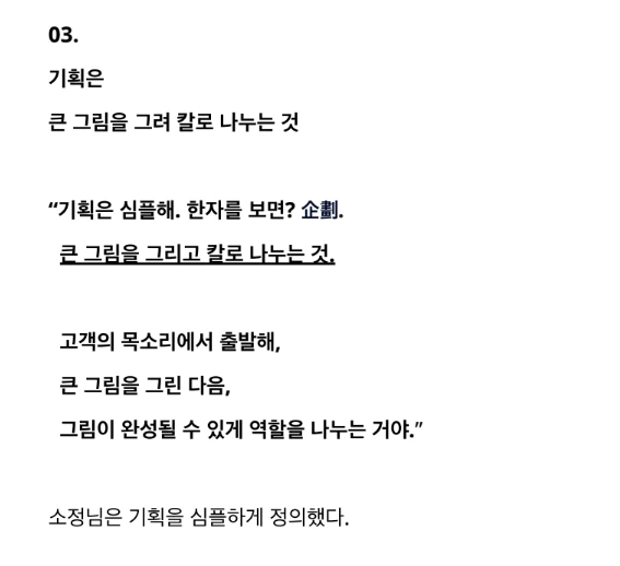 기획이란 큰 그림을 칼로 나눠 역할을 주는 것이라는 점이 공감된다.