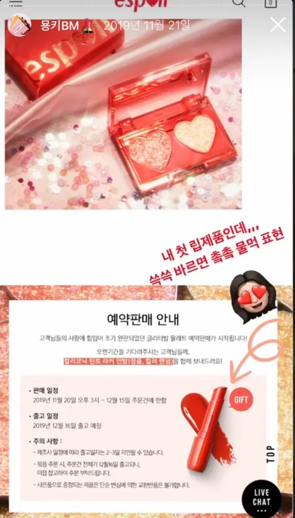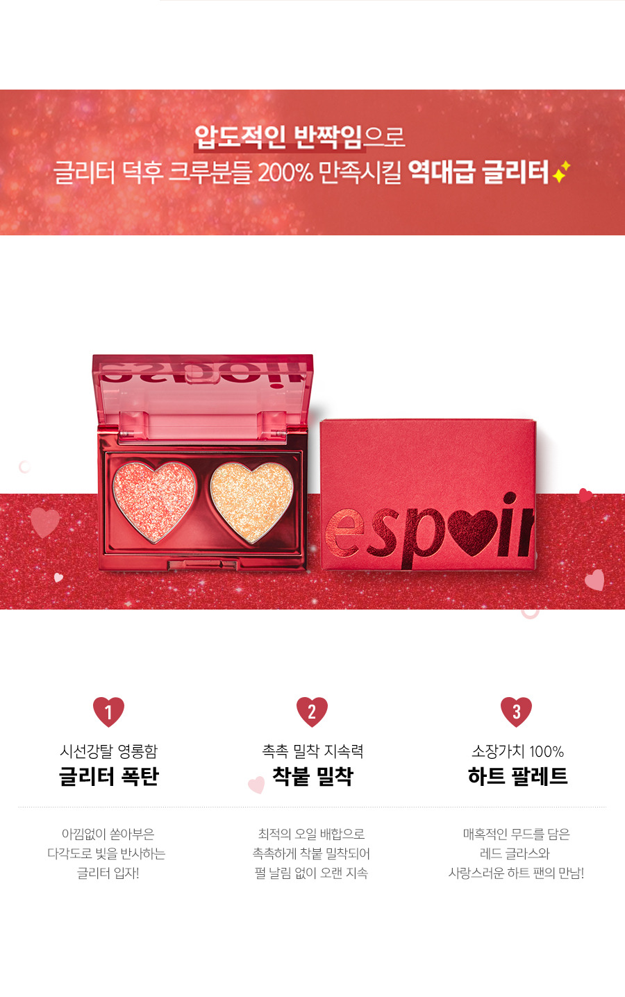 주요 제품: 글리터 밤 팔레트 1 SKU, 립업 틴트 2 SKU, 벨벳 하트 파우치
