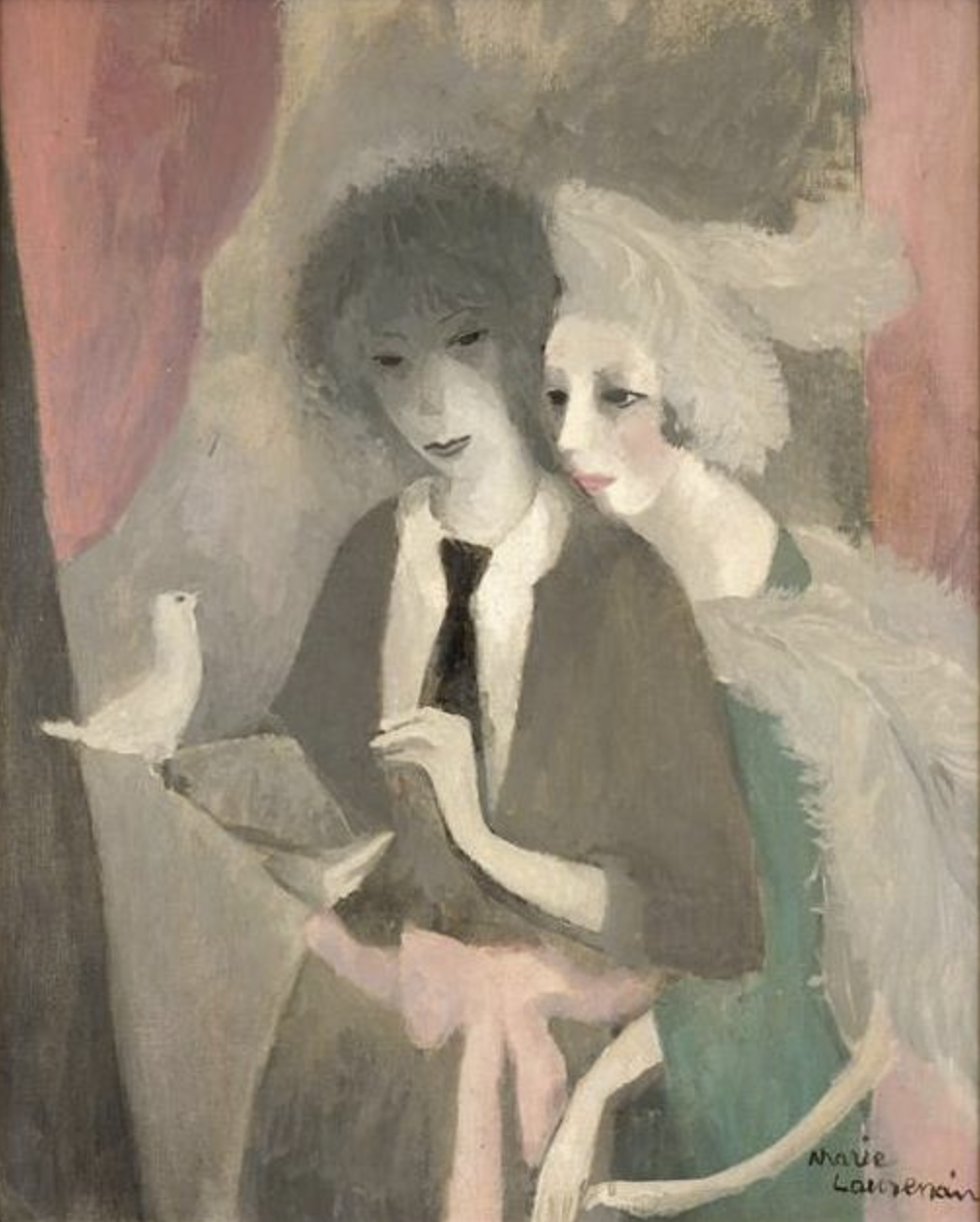 정치인이었던 생부의 외도로 태어난 로랑생은 어머니와 함께 외부로 드러나지 않는 삶을 살아야만 했어요. 아버지로 부터 어느 정도의 경제적은 도움은 받은 것으로 알려져 있지만 사생아로서의 결핍은 그녀에게 상처로 자리잡았을 거에요. 결국 훗날 자신의 출생에 대해 알게 된 로랑생은 지금껏 그렸던 남자를 모두 여자로 바꾸어 버립니다. 이후부터, 특히 아폴리네르와의 이별을 겪은 후 부터는 그녀의 그림에서는 좀처럼 남자의 모습을 찾아보기 어렵게 돼요. 하지만 이러한 고난의 과정이 그녀만의 부드러운 색체와 독창적인 그림을 만들어 가게 되는 힘이 됩니다.