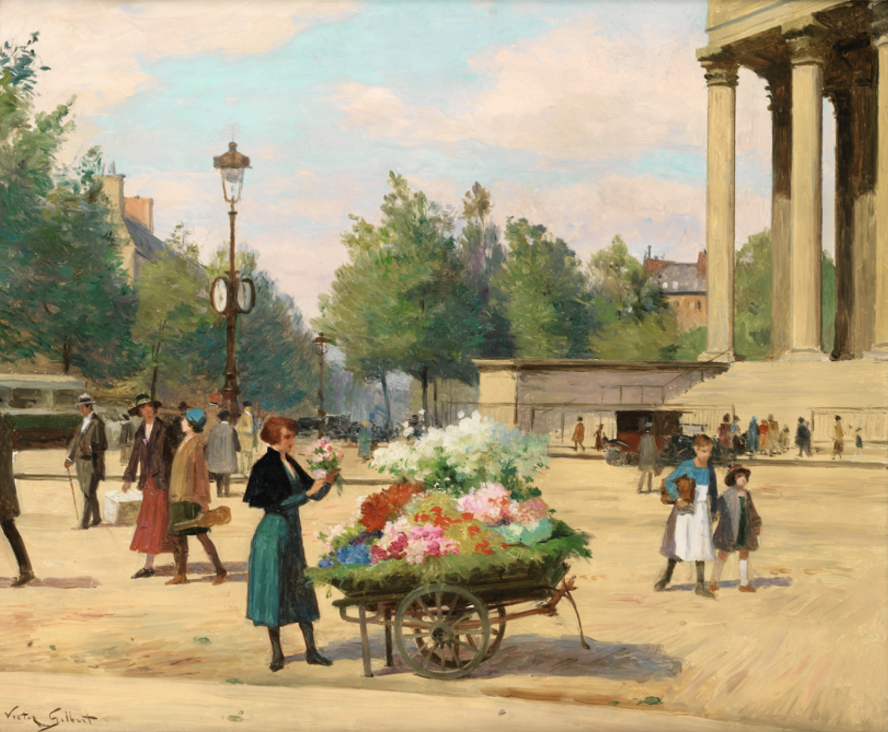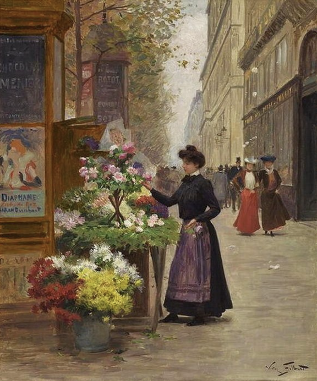 질베르는 시장 내 꽃가게에 대한 그림도 무척이나 많이 그렸어요. 한편으로 그는, 마음이 따뜻한 화가가 아니었을까 생각해 봅니다. 시장이라는 북적이는 공간에서 꽃에 시선이 머물기는 쉽지 않았을 것 같거든요. 하지만 그는 꽃을 사고 파는 사람들을 애정어린 눈빛으로 바라봐 주었고, 그의 캔버스는 꽃과 사람들로 가득차게 됩니다. 파리 시민들의 평범한 일상이 그의 그림 속에서 예술로 다시 태어나는 것만 같습니다.