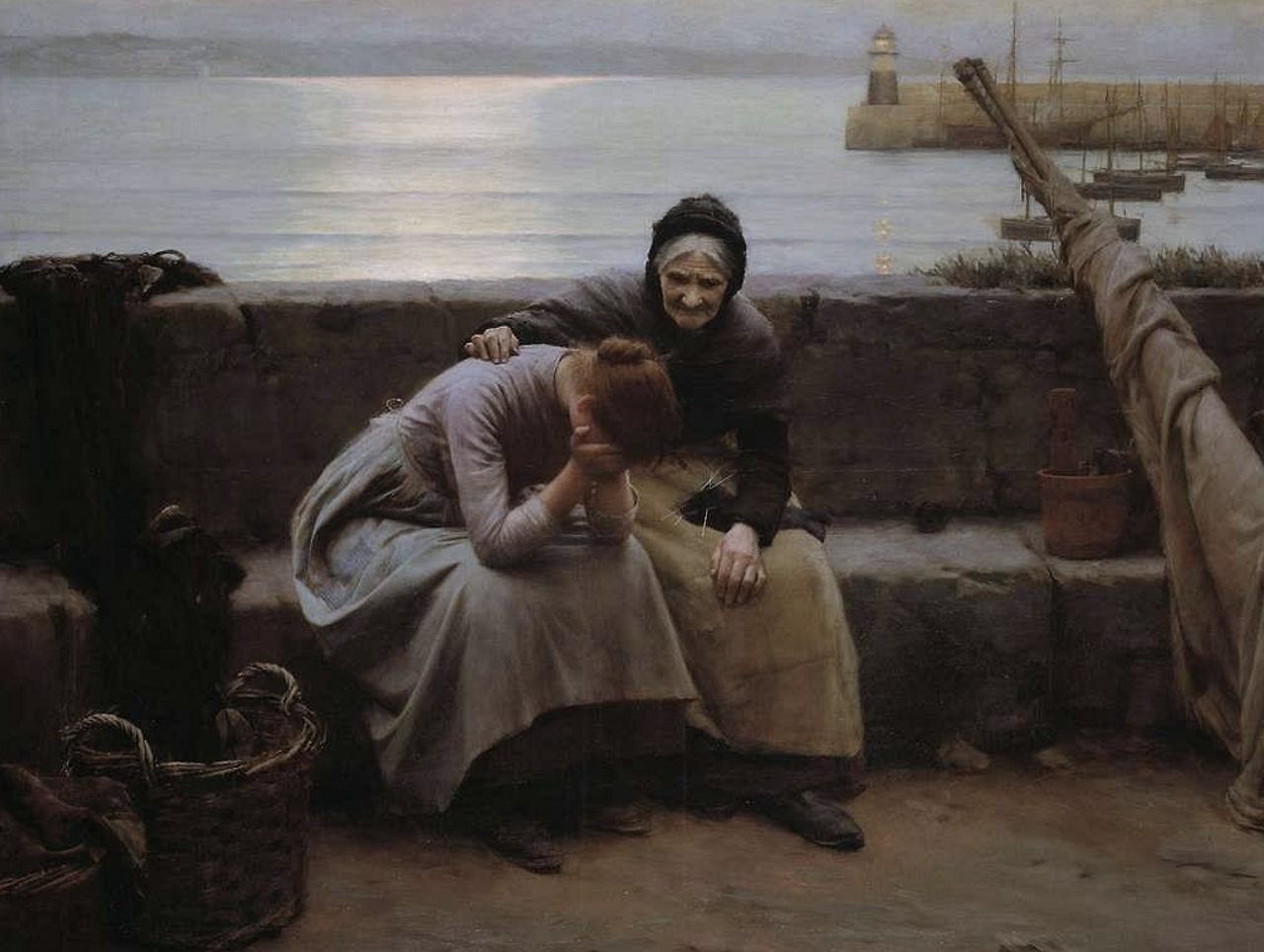 어쩌면 젊은 여인의 남편은 배를 타고 떠났다가 조난이 되었는지도 모릅니다. 한껏 얼굴을 감싼 두 손이 애처롭기 그지 없어요. 옆의 노파는 그러한 그녀 곁에서 아무 말도 하지 않은 채 가만히 손을 얹어 들썩이는 등을 쓸어 줄 뿐입니다.