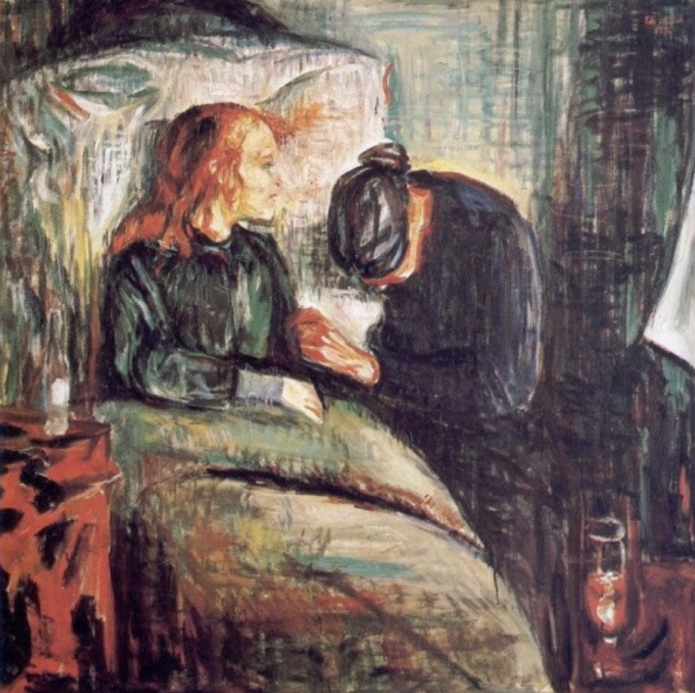 뭉크가 다섯 살이던 해에 그의 어머니가 결핵으로 세상을 떠납니다. 꼬마 뭉크는 얼마나 큰 충격과 상실에 빠졌을까요? 쉽게 상상이 되지 않습니다. 그러나 이는 뭉크 불행의 시작일 뿐이었습니다. 뭉크가 14살이던 때에 어머니의 빈자리를 채워주었던, 형제 중 가장 친했다고 알려진 한살 터울의 누나인 소피가 어머니와 같은 병인 결핵으로 사망합니다. 이후 소피는 뭉크의 그림에서 아프거나 죽음을 앞둔 소녀의 모습으로 자주 표현되기도 해요.