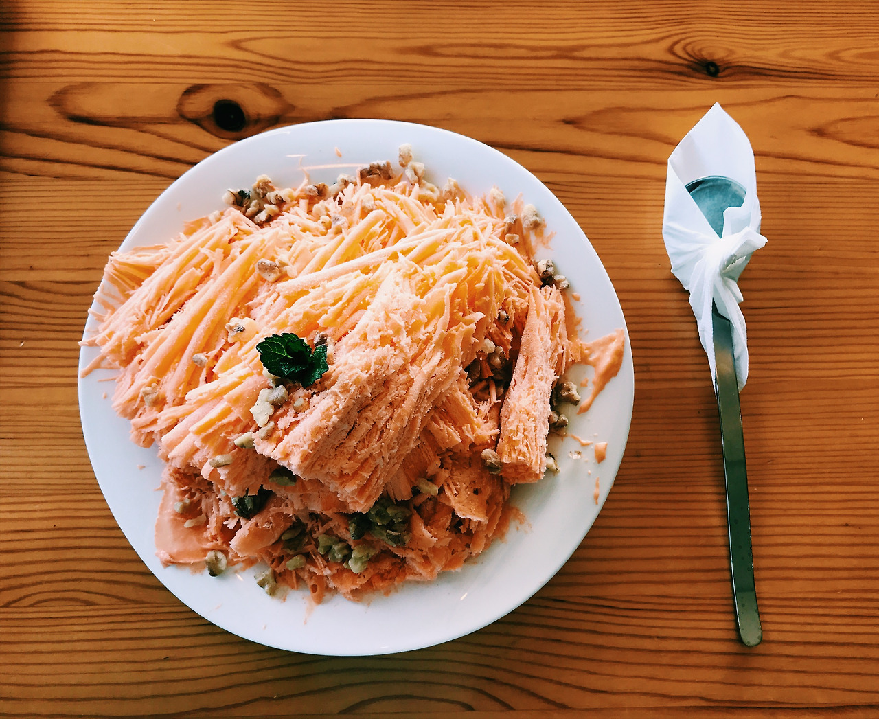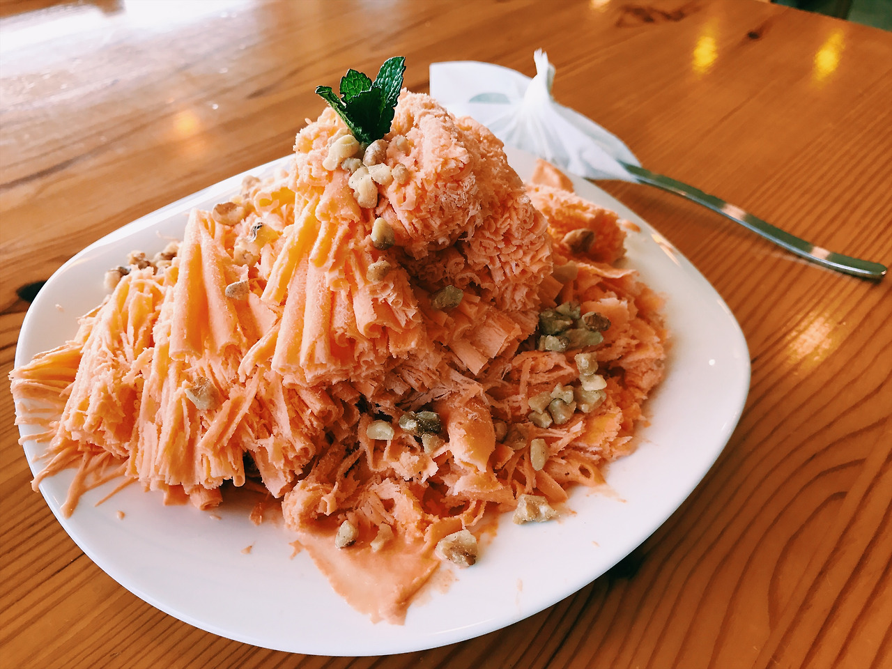 마을 구석구석을 돌며 느낀 것은 제주도는 마을 투어도 매력적이란 것이다. 오히려 바람도 적고, 따뜻한 햇살을 느끼며 적막한 속도를 즐길만했다. 스쳐지날 수도 있는 돌담길이 달리 보인다. 흔하게 볼 수 있는 무밭이 오늘따라 더욱 정겹다. 마음이 비워진 모양이다. 새롭게 채워지는 것만 봐도 혼자 여행하길 잘했다는 생각이 들었다. 저녁시간이 되기 전에 당근 빙수를 먹으러 가고 싶었다. 위치는 종달리 내에 있는 카페이다. 종달리는 당근 농사로 유명한 곳이다. 여기서 생산되는 당근은 당도가 높다. 지역 농산물을 이용해 메뉴로 만든 것이다. 사실 종달리 '당근 빙수'는 유명하다. 이미 많은 블로거들 사이에서 호평을 받았다. 올레길 1코스 지나가는 길목에 위치해 있기 때문에 사람들의 발길이 끊임없다. 반나절 자전거로 땀을 뺐으니 시원한 빙수가 당기는 순간, 급하게 변명거리를 찾았다. 여기까지 왔는데 당근 빙수는 먹어야 하지 않겠나 싶었다. 빙수는 1인 메뉴로도 충분했다.(사실 나만 시킨 것은 아니다. 홀로 여행객들은 꼭 시키는 메뉴란다) 겉모습은 흔하게 보는 빙수와 똑같다. 다른 점이 있다면 주황색이라는 것이다. 게다가 당근 향이 묘하게 올라온다. 차가운 빙수에게서 당근 향이 올라온다. 첫 숟갈에 목 넘김이 시원하다. 그다음 숟갈부터는 당근 향과 우유가 절묘하게 섞여 넘어온다. "향으로 먹는 빙수였구나!"