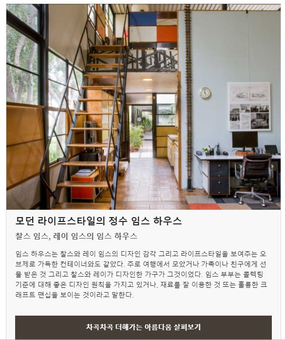약간 인문학이라고 해야 할지는 모르겠지만 그렇다고 깊은 철학을 요구하는 건 아닙니다. 가볍게 볼만한 내용들입니다. 머리 식히는 용도나 평소 인테리어 쪽에 관심이 많은 사람들에게는 좋을 내용이죠. 저는 매주 금요일 산뜻한 기분으로 퇴근할 때 익습니다.