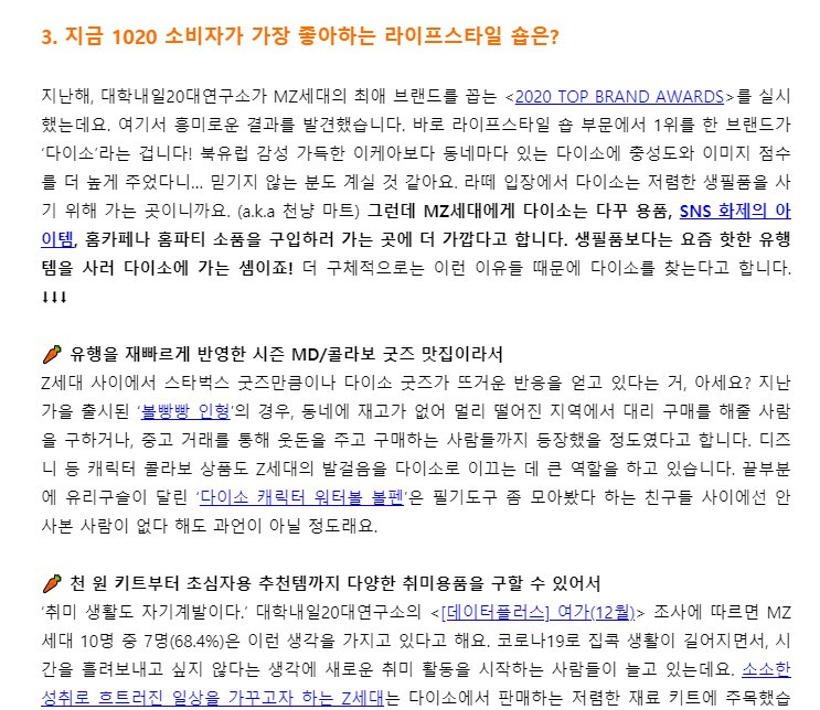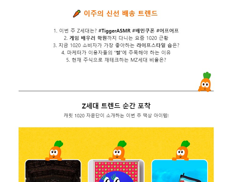 밀레니얼 세대를 대상으로 사업을 하거나 마케팅 업종에 있는 사람이라면 구독을 추천드립니다. 미래의 소비자이자 젊은 트렌드를 이끌어 가는 세대들이 뭘 좋아하고 어떤 것에 반응하는지 한눈에 정리해 주거든요. 쉽게 말해서 유행하는 아이템, 신조어 등 힘 안 들이고 매주 알 수 있죠.