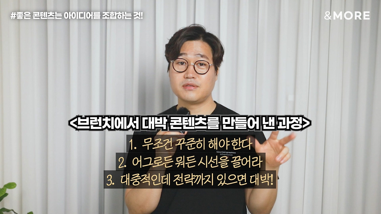 다 중요하고 지속하기 어려운 부분이죠. 하지만 이것보다 더 힘들어하는 게 있습니다. 바로 '꾸준함'입니다. 꾸준하게 콘텐츠를 만들어 내지 못한다면 앞서 이야기한 것들은 아무 의미가 없는 것이죠. 영상 1~2개 잘 만드는 거 누가 못하나요. 좋은 퀄리티의 영상을 매일 만들어 내는 것보다 지치지 않고 꾸준히 오래 운영하는 게 더 중요합니다.
