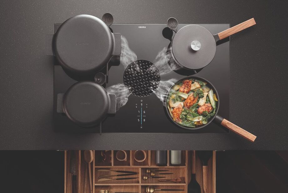 - 손잡이나 불필요한 기구들 없애기: 식기세척기, 냉장고, 냉동실, 스팀오븐, 콤비오븐은 모두 원터치 방식이라 나무에 손을 대지 않고 팔꿈치로만 살짝 밀어도 열리고 닫히는 구조라 관리가 좀 더 편합니다. 손잡이가 없어서 보기 더 깔끔해 좋아요. 인덕션도 만족스럽게 잘 쓰고 있습니다. 보라 (Bora)의 인덕션인데요, 정말 신기술이 따로 없습니다. 인덕션에 내장된 흡수구를 통해 연기랑 냄새 석션이 아주 잘 되어요. 따로 천정에 뭘 달 필요가 없습니다.