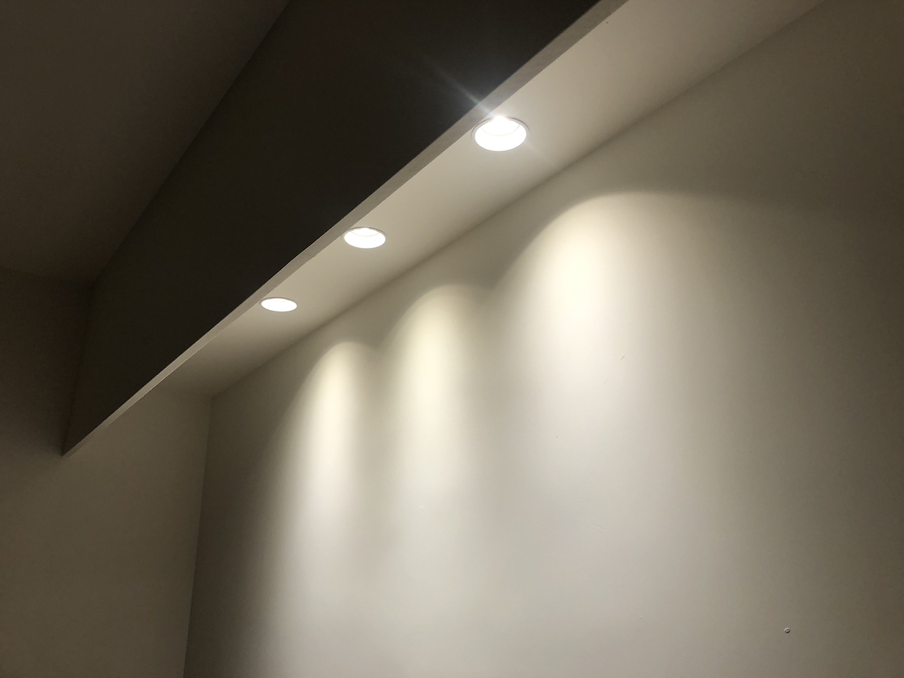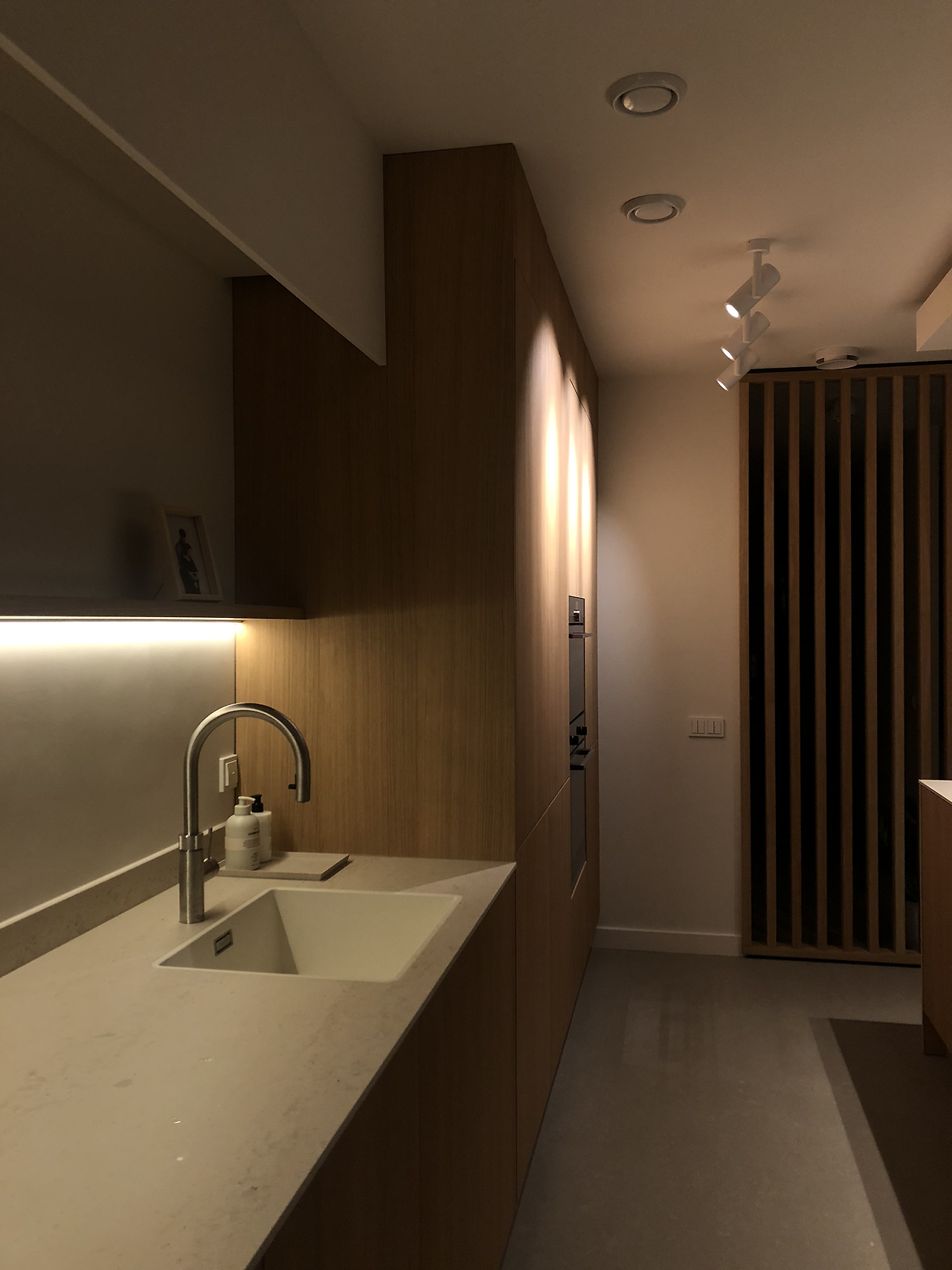 - 다양한 조명: 요리하거나 음식을 먹기 위한 조명, 무드를 위한 조명, 악센트 조명을 많이 고민해서 그만큼 많이 단 것 같습니다. 잘한 것 같아요. 식탁 위의 조명 (제가 20대 때부터 가지고 싶었던 PH5를 달았습니다. 요새는 한국에서 화이트 인테리어 모두 이 조명을 하시는 것 같아요! 사실 빛이 굉장히 은은해서 디자인은 예쁘지만 먹기에는 불편한 것 같습니다.) 그리고 커피코너 위의 조명을 위해 천장을 낮추는 대신 나무판을 달고 그 뒤에 조명을 달아 간접조명 효과를 주었습니다. 전형적인 '그리드 (grid)' 형태가 아니라 대칭에 살짝 비켜가면서도, 조명을 3개씩 모아 조화롭게 만들었습니다.