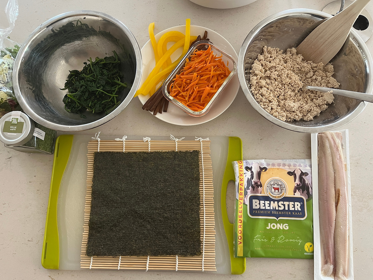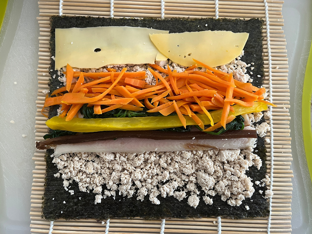 이것도 일이더랍니다. 마른 팬에 물 좀 빠진 두부를 으깨며 볶고, 식히고 면보로 물을 짜주었습니다. 그런데 물이 너무 빠졌는지, 만약 으깬 칠면조나 닭가슴살이 뻑뻑한데, 하루 정도 실온에 놔두어 푸슬푸슬해지면 나올 질감이 되었습니다. 이걸로 뭐가 싸질까 싶었지만, 물을 흠뻑 먹은 두부로 김밥을 싸도 물러 터지는 걸 알고 있거든요... 어쨌든 내가 먹을 건데 뭐 어때하는 자신감에 그냥 직진했습니다. 그리고 여러 가지 비디오에 의하면 김밥 쌀 때 위에 치즈를 붙여주면 김밥이 말릴 거라더군요. 그래서 해보았습니다~