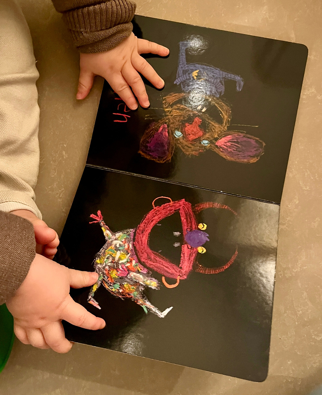 색색 크레파스로 예쁘게 흰 도화지를 채우고 검은색 크레파스로 모든 면을 덧칠을 한 후, 이쑤시개로 긁으면 검은색 안에 숨겨진 색이 나와 특별한 그림을 그릴 수 있던 거... 기억나시나요? 온통 검은 동화책이 제게는 생소하지만 여러 책 중 미스반하우트 동화책을 띡~ 고르는 아기를 보면 아기들 눈에 띄긴 하나보다 싶습니다.