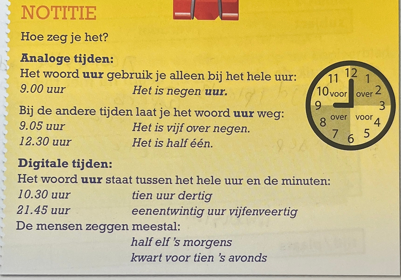 네덜란드의 시간보기가 다른 점은 두 가지다. 우선 삼십 분을 기준으로 그 전이면 그때 시각을 쓰고 그 후면 그 후 시각을 쓴다. 무슨 말이냐면, 시간이 3시와 4시 사이일 때 분침이 시계의 6시 표식 전에 있으면 3시 대 (?)인 것이고 6시 표식 후에 있으면 4시 대이다. 3:30은 세시 반이 아니고 네시 반 전 것이다! 반이 넘었으면 사사오입처럼 반올림해 쳐주는 거다. 절대 익숙해지지