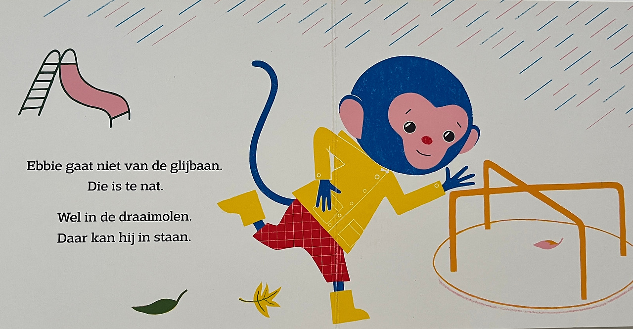 낙엽이 떨어진 가을, 비가 오는 날 비옷과 장화, 우산을 챙겨 놀이터로 간 원숭이 ‘애비’(Ebbie)는 버섯하고 거미를 구경하고 물웅덩이에서 첨벙거린다. 미끄럼틀은 젖어서 안 타고 뺑뺑이를 탄다.
