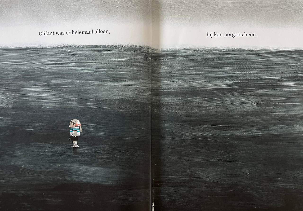 온통 먹구름인 회색 하늘 검은 바다에 작은 돌 위에 서있는 코끼리 마음을 네덜란드 아이들은 알아야 할까? (다행히도 코끼리는 다른 동물들과 함께 이 돌섬을 멋진 명소로 만든다)