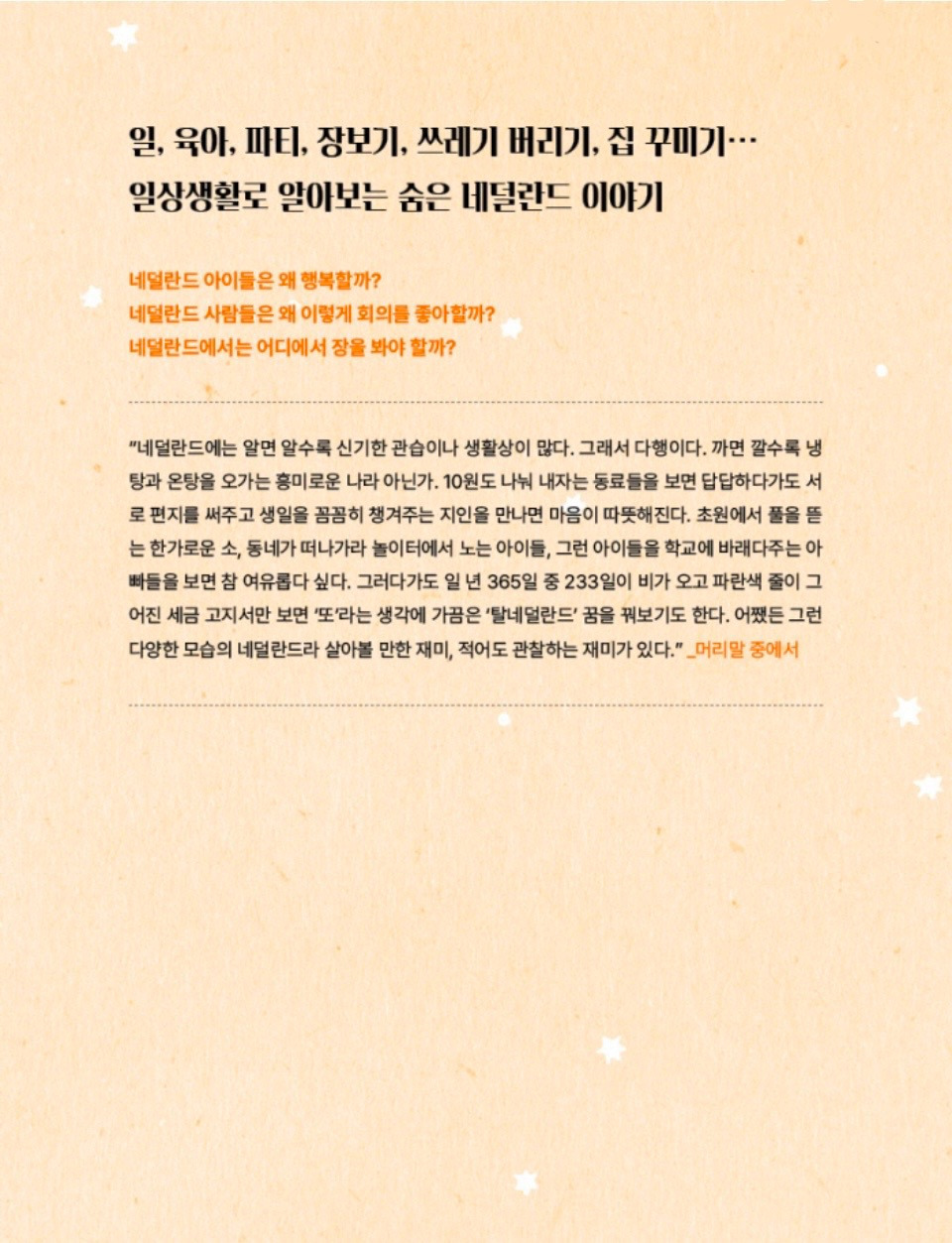 이 책은 네덜란드 문화의 다른 점을 두고 가볍게 소개하거나 판단하기 보다, 제가 겪은 문화차이를 저 스스로 이해하고 적응하는 과정의 결과물입니다.