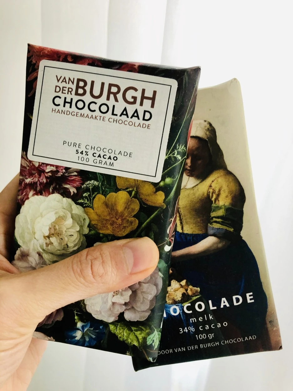 네덜란드 출신의 유명한 화가들이 많지. 반 고흐, 렘브란트, 베르메르, 몬드리안... 명화가 그려진 뭐든지가 선물하기 좋은 것 같아. 아래는 산책하다 발견한 카페에서 득템한 초콜릿 바들. 뮤지엄 숍에 가거나 백화점에 가면 여러 가지 제품이 많이 나와있어. 심지어 반 고흐의 감자 먹는 사람들에서 영감을 받는 반 고흐 감자칩도 있더라.