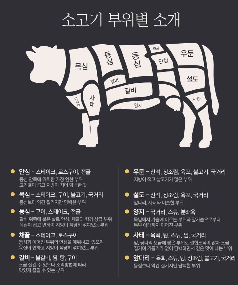 알아두면 요긴한 (하지만 절대 안 외워지는) 소고기 부위차트 참고해~