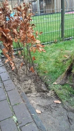 그리고 온갖 나무를 심을 거라는 신주택 전개도에 대비해 실제 건설사에서 제공하는 묘목은 바람에 불려 날려갈 것 같은 나뭇가지에요. 그나마도 다른 나무 (부켄하흐가 아니라 좀 떨어지는 하흐부켄이라는)를 제공했다니, 사람들이 다른 나무를 심으려고 하는 게 이해가가지요.