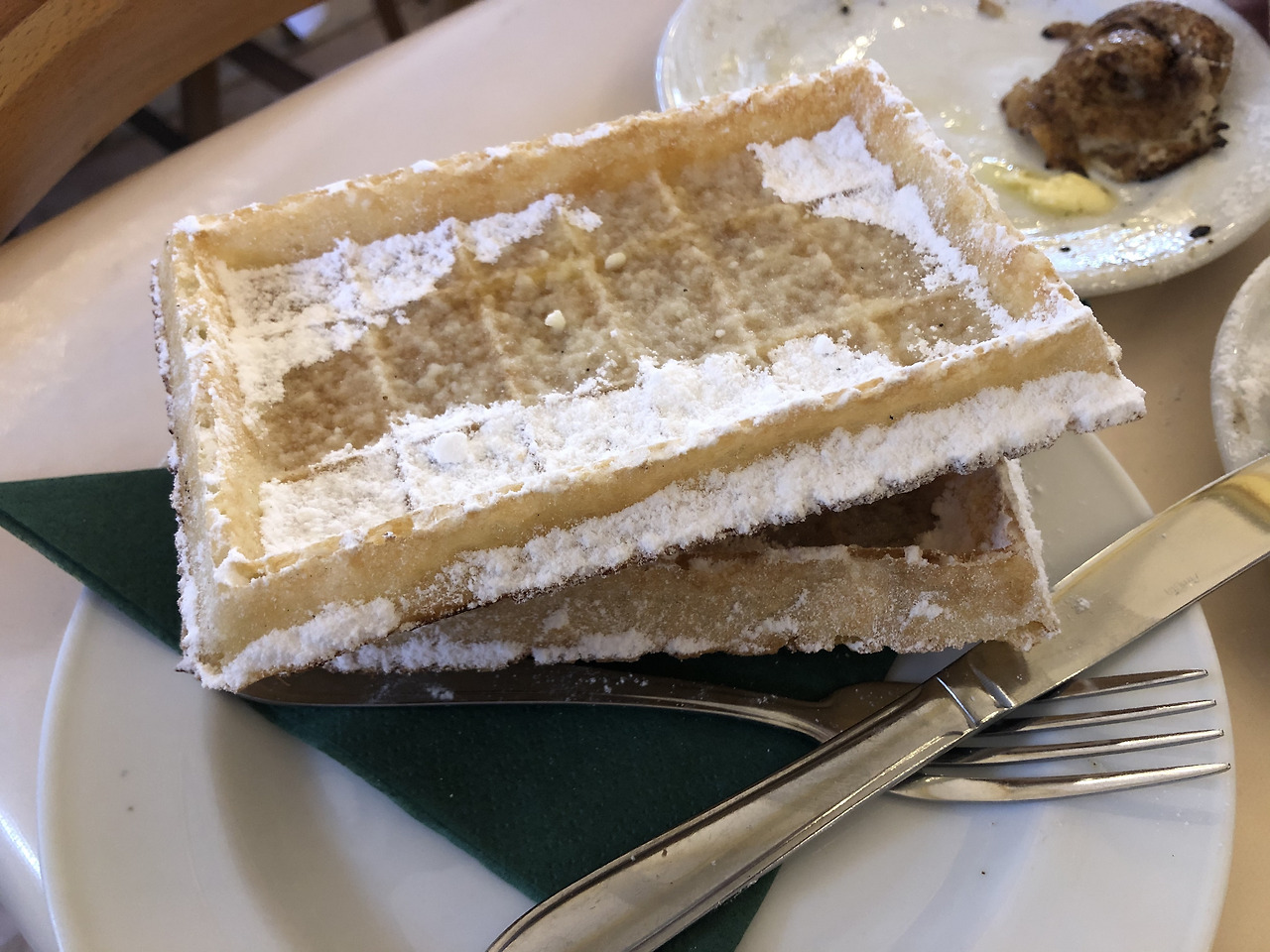 알고 보니 와플도 함께 파는 곳이었어요. 우리가 아는 와플 하고는 다르게 아주 얇고 바삭바삭한 네모난 와플인데요, 200년도 더 된 무쇠 오븐으로 구워 만들더라고요. 포퍼쳬스와 와플을 만드는 과정이 인상 깊어서 비디오에 담아보았습니다.