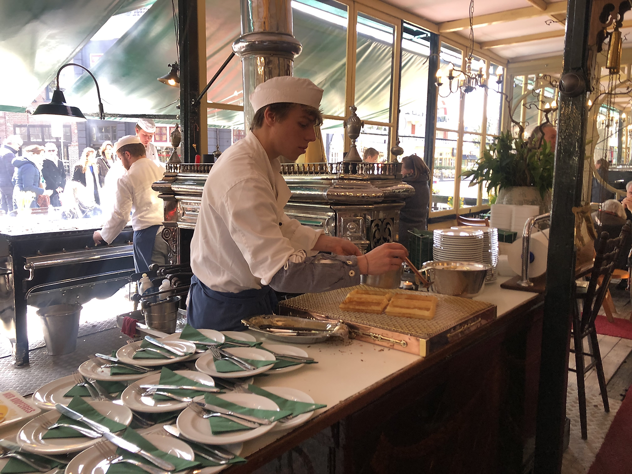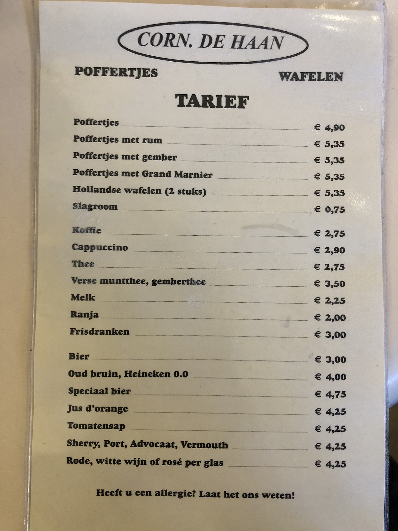 저희도 자리를 잡아 메뉴를 보고 있는데, 메뉴에 함께 적힌 역사에 대한 노트를 읽으니, 역시 1837년부터 시작되었다는 전통이 있는 곳이었어요. 1837년의 사람들도 지금과 별반 다르지 않겠다 싶네요. 옷만 다르지 다 이렇게 포퍼쳬스를 먹으려고 들떠 왔겠죠?