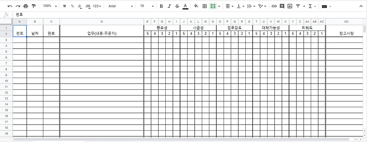 이에 컨트롤프릭이 가만히 있기 너무나도 고통스러운 나머지, 업무에 순위를 매기기 시작했습니다. 바로 중요성, 시급성, 업무강도, 대체가능성, 리워드로 1~5로 나눈 것입니다. 중요하고 시급한 업무는 주로 중간관리자 이상의 직원분들이 가져오신 리스트로 구성되기 마련이었고, 동시에 "거, 우리 막내 일하는게 빠르고 정확하네"라는 평가를 받을 수있는 리워드가 있었습니다. 사담이지만.. 동일한 업무더라도 스타벅스 커피나 생딸기 요거트를 종종 사주시는 경우, 될 수 있는 한 먼저 작업에 들어가는 등의 핑퐁이 이루어지기도 했습니다.