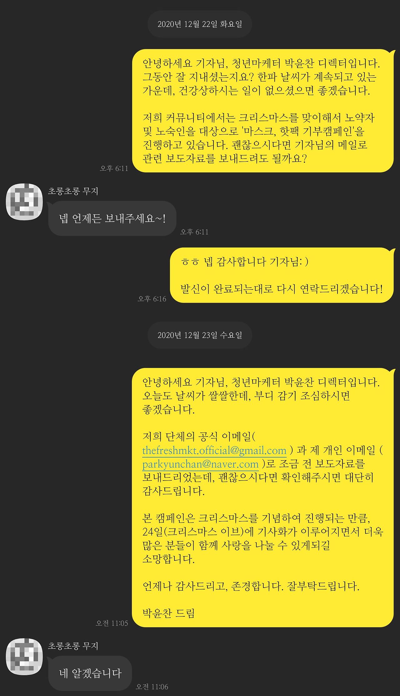 식사를 마친 후 다시 업무에 임하시는 시간대입니다. 모든 직장인이 그렇듯, 하루 중 가장 마음이 넉넉하고 인심이 후할 때가 아닐까 합니다(...). 출입처에 돌아오신 기자님들은 제게 연락을 해주십니다. 이때 보도자료를 설명드리면서 리멤버 등 명함을 교환합니다. 이를 통해 기자님의 개인이메일과 연락처를 저장할 수 있었고, 향후 새로운 보도자료가 나가면 이렇게 연락을 주고받곤 합니다.