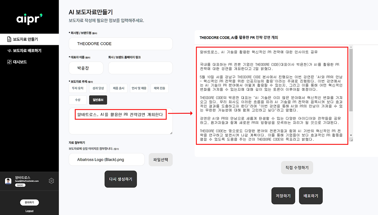 ChatGPT를 사용하시거나 뤼튼과도 같은 생성형 AI를 사용하셔도 무방합니다. 다만 보도자료의 문법과 문체를 적용해야하기에 프롬프트를 입력해야하는 번거로움이 있습니다. 이 경우, 경쟁사의 기사 링크를 전달하면서 톤앤매너를 맞추라고 제시하면서 길들여야하기도 해요. 그러나 AIPR은 프롬프트 입력이 완료되어 있는지라 비교적 편하게 작성을 할 수 있습니다. 단 한문장을 작성하더라도 언론의 문법을 지키면서도, 관계자 인용 코멘트까지도 작성을 해주니 참 편리합니다.