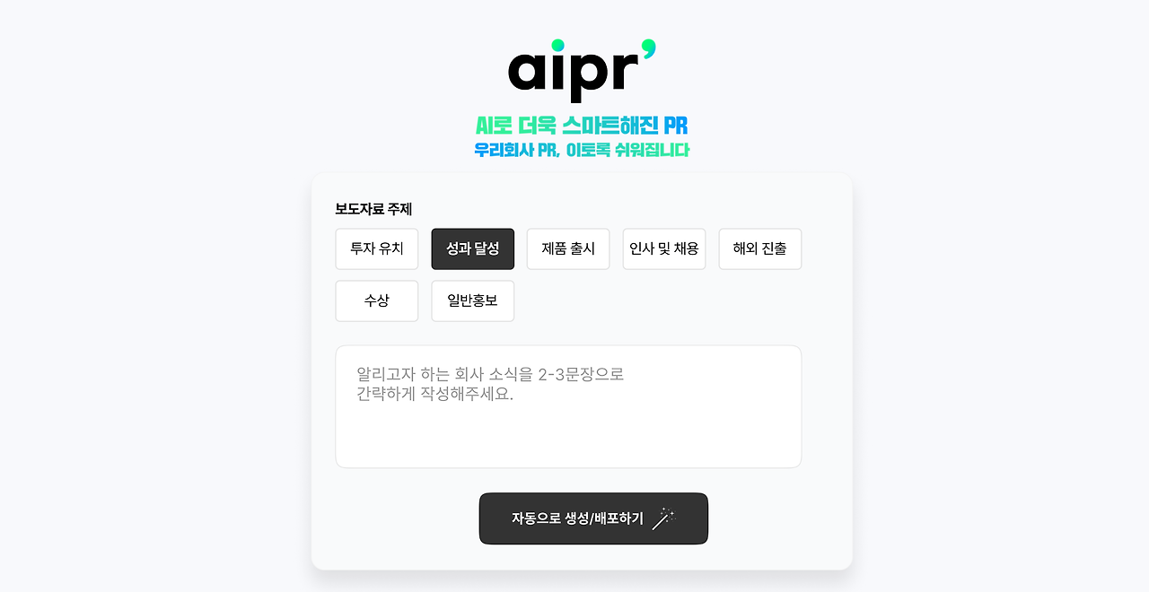1ZLabs(원지랩스)가 선보인 AIPR은 제가 참 사랑하면서도 두려워하는 솔루션입니다. 언론홍보를 맡아본 실무자라면, 보도자료에 들어가는 글과 이미지를 준비하든 것이 얼마나 번거로운지 잘 아실겁니다. 저는 처음 PR을 맡을 때에는 800자 분량의 보도자료를 제작하는데 3시간이나 걸렸고, 이것을 15분까지 단축시키기 위해서 5년이라는 시간이 필요했습니다. 그런데 AIPR은 보도자료의 7가지 카테고리(투자유치 / 성과달성 / 제품출시 / 인사채용 / 해외진출 / 수상 / 일반홍보)를 선정하기만 하면 30초만에 모든 제작을 마칩니다.(#)