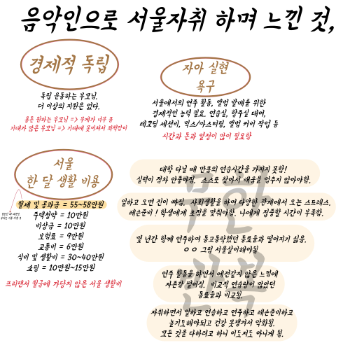 경제적 독립을 위해 2020년 1월 코로나가 터지기 직전 서울로 두 번째 상경을 했다. 20살 때 처음 그리고 26살 때 두 번째 상경. 졸업 후 3개월 정도 통영 본가에 머물렀다. 문화, 예술의 도시라고 불리는 통영이지만 청년 일자리가 없는 이곳에서 무엇을 꾀하기란 직접 창업을 하지 않고서는 어려운 일이었다. 하지만 그 무엇보다 함께 음악 활동을 하자고 약속했던 대학교 동기들이 모두 서울에 있었기에 그 소속에서 떨어져 나오긴 죽어도 싫었다.