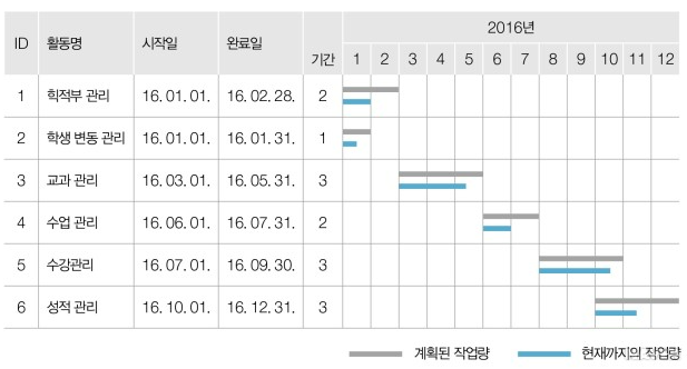 *간트차트 : 일정 계획 기법. 간트 차트(Gantt chart)는 프로젝트 일정 관리를 위한 바(bar) 형태의 도구이다. 프로젝트의 주요 활동을 파악한 후, 각 활동의 일정을 시작하는 시점과 끝나는 시점을 연결한 막대 모양으로 표시하여 전체 일정을 한눈에 볼 수 있게 한다. [그림 3-14]처럼 활동은 막대로 표시하고 그 길이는 활동의 작업 시간과 비례하여 나타낸다.