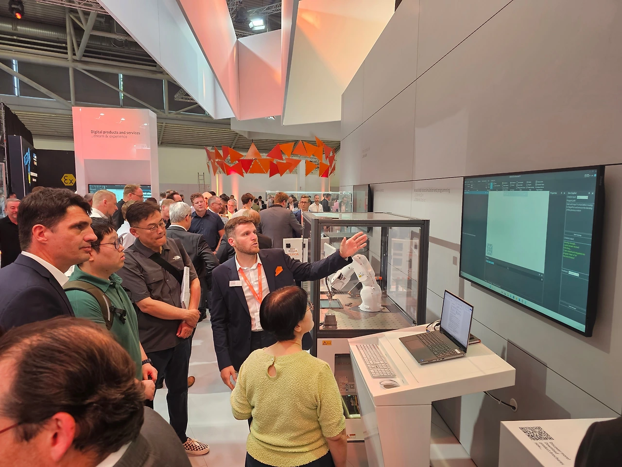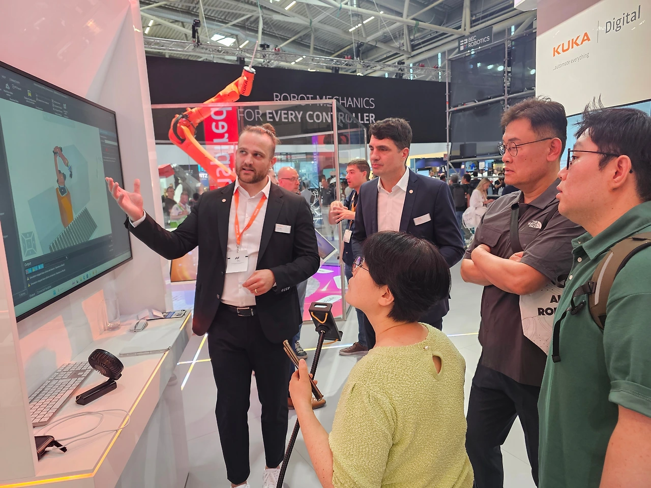 전시장에서 오후 일정은 길지 않았다. 다행히 기업 견학 일정은 모두 취소되었지만 전시회에 참가한 기업 중 KUKA라는 산업용 로봇 제조사 부스의 그룹 견학 기회를 얻어 우리 일행모두가 1시간가량 담당 매니저를 통해 부스 전체에 대한 설명을 들을 수 있었다. 개인적으로 돌아다니며 궁금한 점을 하나하나 물어보는 것보다, 이런 식으로 전체적인 콘셉트에 대한 설명을 듣고 어떤 주제로 전시기획을 했는지 듣는 것이 굉장히 좋은 기회라고 느껴졌다. 물론 하나하나 들어보면 대단히 특별한 내용이 추가되는 것은 아니겠지만, 부스전체를 가이드받으면서 자연스럽게 주제별 데모 플로우를 보고 들을 수 있어서 이해하는데 도움이 많이 되었다.