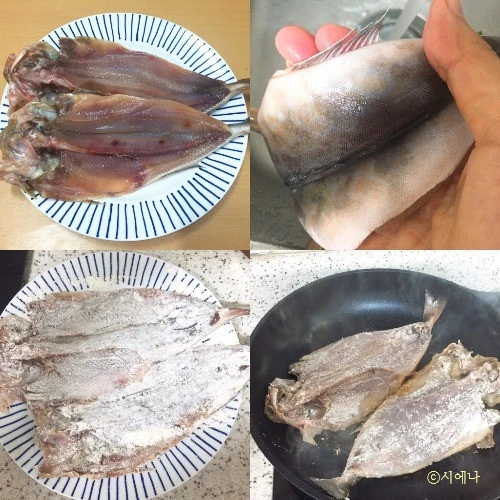 임연수가 흡수한 수돗물이 빠지도록 잠시 채반에 얹어두었다가 소금을 살짝 뿌린 뒤 평평하고 넓은 접시에 밀가루 이불을 깔아준다. 깨끗하게 씻은 임연수를 앞으로 뒤로 번갈아 뒤집어 뽀얗고 하얀 밀가루 이불을 덮어준다. 이때, 밀가루 튀김 옷이 너무 두꺼워지지 않도록 서너번 무심하게 툭툭 털어주는 것이 포인트!