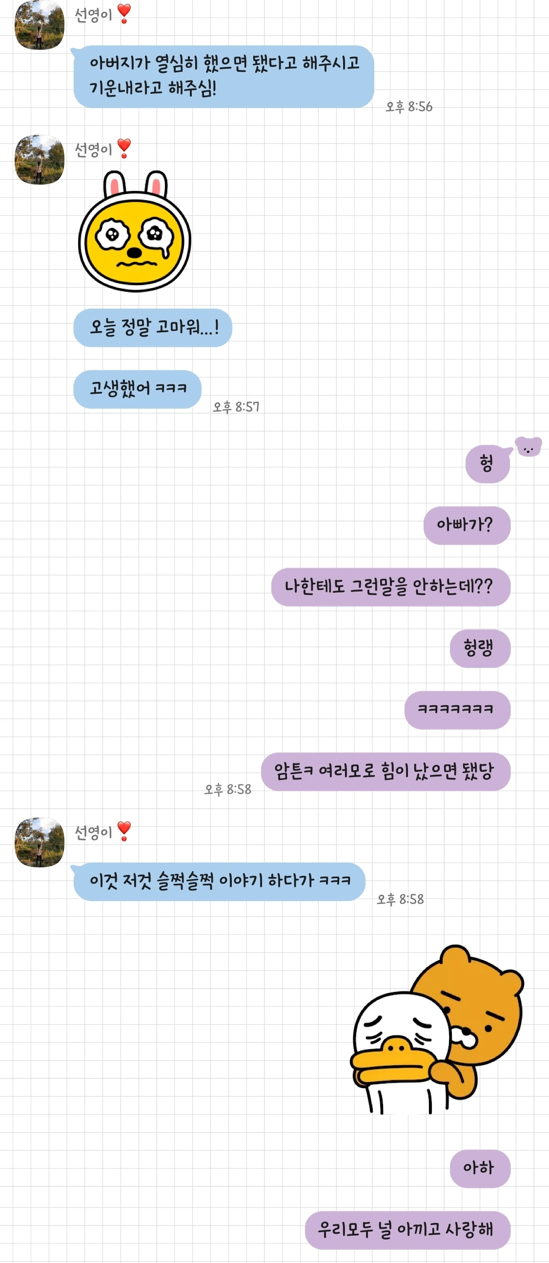 여전히 아빠는 내 오랜 친구들과도 가깝다. 기숙사 생활을 하던 고등학생 시절부터 친했던 친구들과 늦은 시간까지 만나면, 날 데리러 나온 아빠가 친구들도 집까지 데려다 준다. 아빠는 선옥이를 선만이라부르고, 아람이네 집 앞 어두컴컴한 뚝방길을 걱정한다. 또 다른 친구 선영이에게는 나에게도 하지 않는 위로의 말을 건네기도 했다.