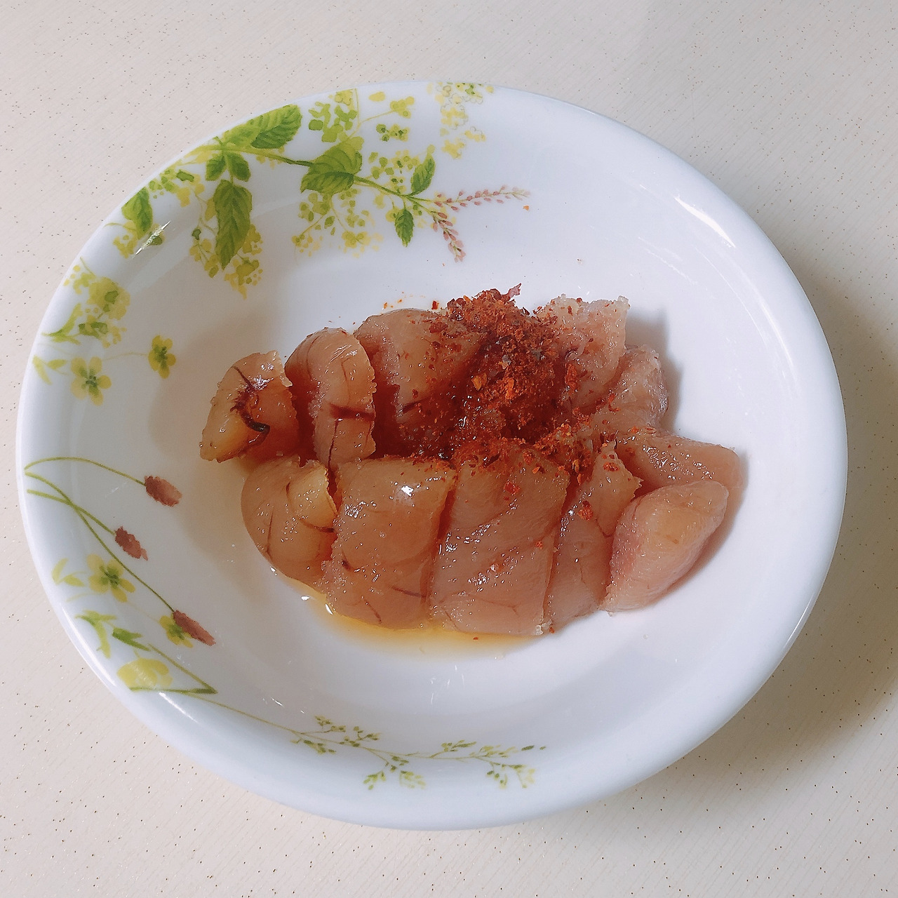 2.명란젓을 가위로 1~½마디 정도로 자른다.