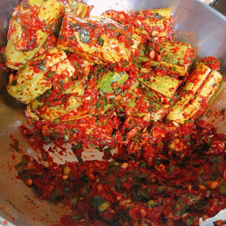 참고로 밀가루 풀을 쒀서 넣는 집도 있지만, 우리집은 넣지 않는다. 우리집은 아삭아삭하고 싱그러운 풋맛의 오이소박이를 좋아하며 오래 즐기기를 원하기 때문이다. 참고로 밀가루 풀은 김치의 발효를 돕는 유산균의 주된 먹이로 작용한다. 혹시나 푹익은 오이소박이 맛을 좋아한다면, 밀가루 풀을 쒀 넣으면 된다.