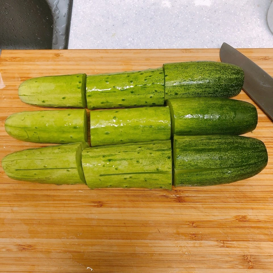 오이의 가지와 꽁지는 쓴맛이 나니 0.5cm정도 과감하게 자른다. 그후 남은 오이의 전체 길이를 보고 1/3 혹은 1/4 등분으로 재단하거나 아예 오이 통에 열십자(十) 칼집을 넣는다. 단정하고 우아해보이는 한정식집st로 가려면 오이 전체에 크고 길게 열십자(十) 칼집을 넣으면 되고, 일상에서 보관하거나 먹기 편한 방식을 따르려면1/3등분으로 재단하여 칼집을 넣으면 된다. 칼집을 넣을 때에 유의사항은 끊어먹으면 안된다. 는 것이다.