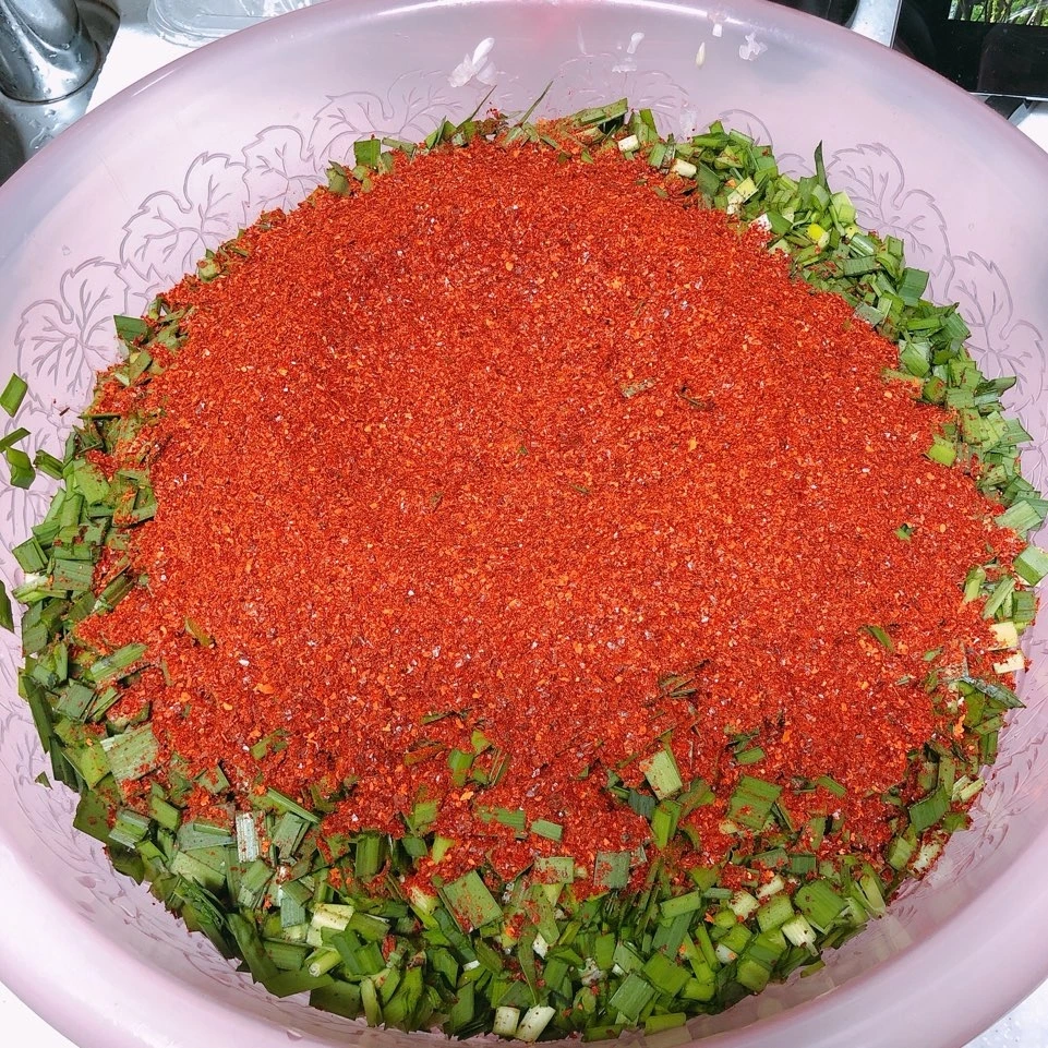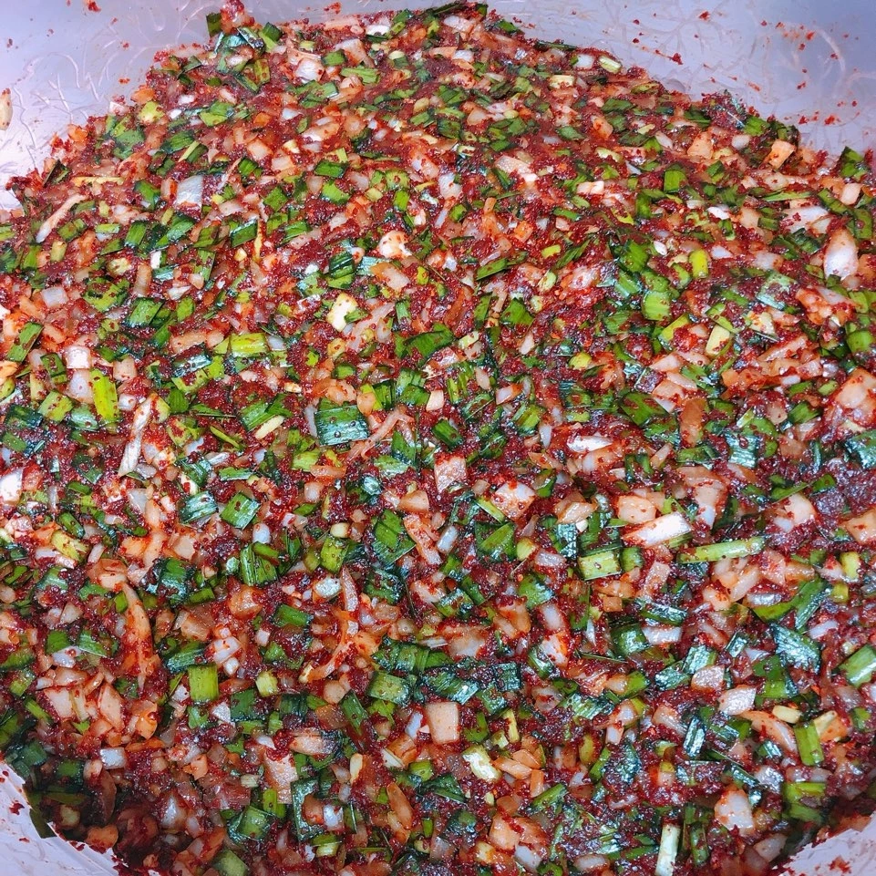 부추와 양파를 다 자르면, 이제 양념을 섞을 차례다.