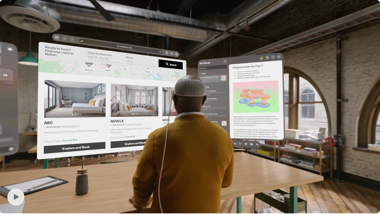 VisionOS는 완전히 새로운 3D 인터페이스를 선보이며 디지털 콘텐츠의 모습이나 분위기가 사용자의 물리적인 세상 속에서 현실적으로 느껴지게 됩니다. 자연광에 동적으로 반응하며 그림자도 드리워 사용자가 공간의 크기감과 거리감을 느낄 수 있도록 돕습니다.
