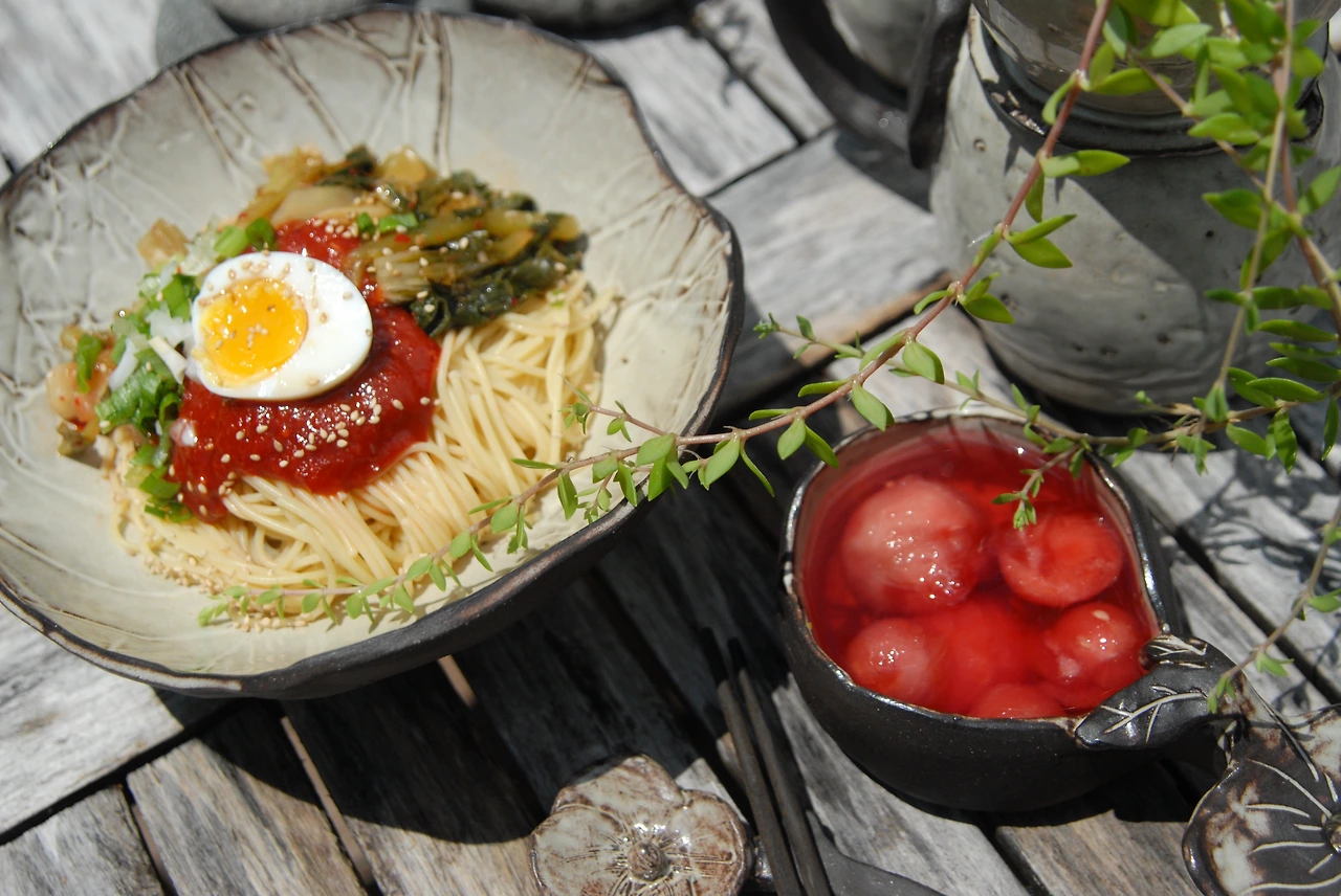 얼키설키 정체모를 그물망에 단단히 묶여있는 항아리 모양의 플라스틱 김치통을 두레박처럼 끌어올려 적당이 숙성된 열무김치를 꺼내 두꺼운 막국수에 슥삭슥삭 비벼주면 참으로~ 그 맛은 눈물이 나도록 황홀한 맛이었다. 이제는 그 시절의 열무국수 맛을 다시는 못 만나볼 자연의 맛이었고, 추억의 맛이었다.