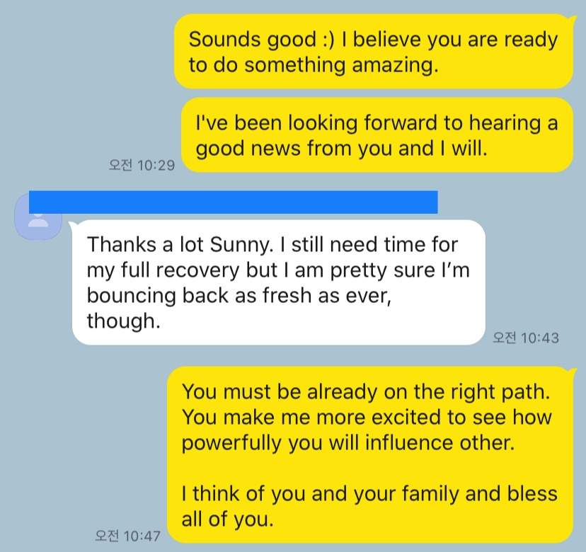 진심은 통하나 봅니다. 이 말에 그분께선 "이젠 다시 튀어 오를 것이라 확신이 듭니다"라고 말씀하시더라고요