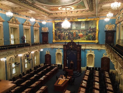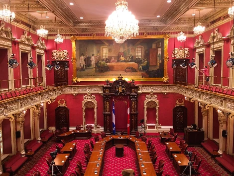 의사당 회의장 의원석에 직접 앉아서 이 설명을 들었다. 당시 퀘벡 주 국회는 엘리트 상원과 서민의 목소리를 대변하는 하원으로 이루어진 시스템이었다고 한다. 푸르스름한 벽의 상원 회의장은 차분하고 건조한 토론이, 붉은색 벽의 하원 회의장은 피 끓는 열띤 토론이 일어날 것만 같은 인상을 주었다.