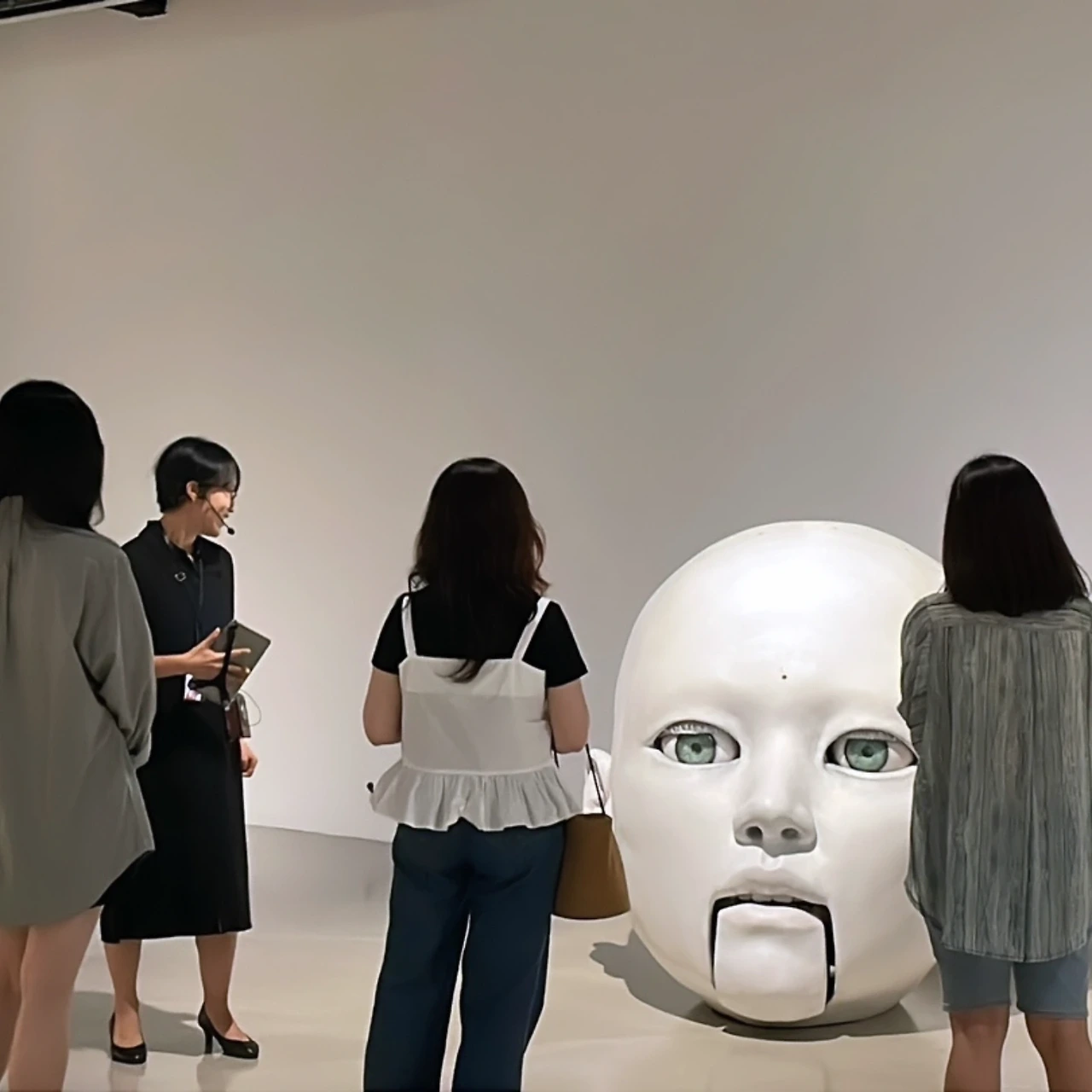 관람객들의 움직임을 인식하고 예쁜 눈동자를 움직이며 관람객과 눈을 마주합니다. 말을 할 때 사람처럼 턱관절을 움직이는데요, 그 모습도 우리와 참 유사합니다. 무엇보다 가장 큰 매력은 관람객과 대화를 한다는 점입니다. 그것도 정말 똑똑하게 말이죠. 어떨 땐 마치 저 안에 실제 사람이 들어 있는 것은 아닐까싶은 착각이 일어날 정도로 '어떻게 이렇게까지 생각할 수 있지!'하는 놀라움을 자아냅니다. 전시장에서 이 친구의 대화를 매을 들을 수 밖에 없는 지킴이 선생님들이 들려주는 이 AI 언어 구사 능력치는 때론 정말 상상을 초월합니다. 어떤 놀라운 행동을 하는지 몇 가지 사건을 들려드릴께요.